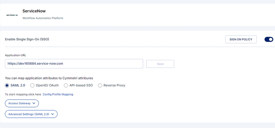 Then enter the instance url in the SignOn configuration of the managed application on the Cymmetri portal.