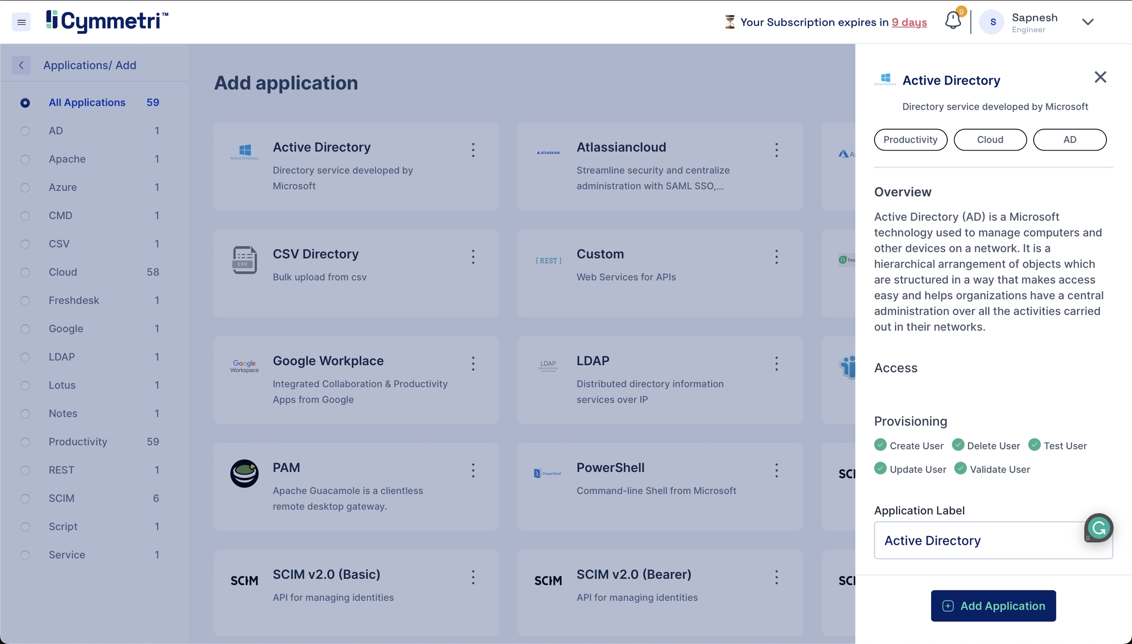 Application Labelhas a default name for the Active Directory application and can be changed according to your choice. Click 'Add Application' from the bottom right to add the Active Directory application to your Cymmetri profile.