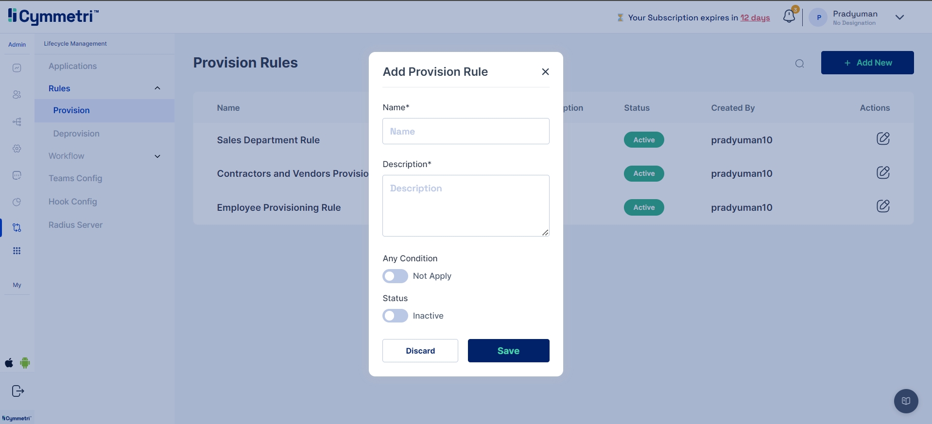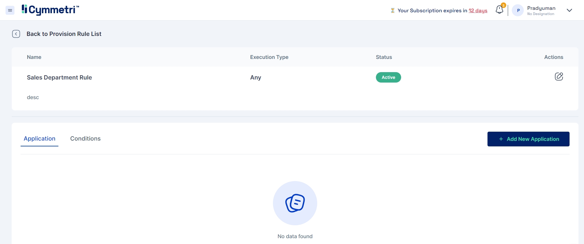 In Cymmetri, administrators have the ability to establish these rules within the "Rules" tab under the Lifecycle Management module. To do so, the administrator navigates to the "Provision" section, where the following page will be displayed.