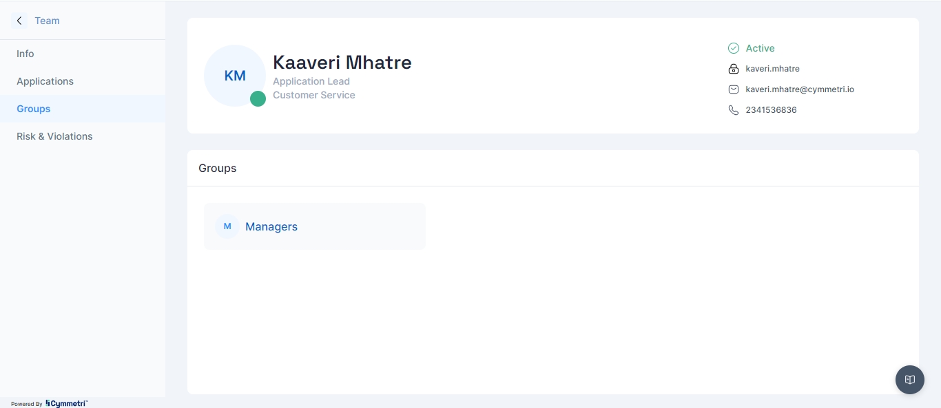 On the Team Page, managers can see a list of all their team members. This list serves as a quick reference to identify team members and access their profiles, applications, groups, and risk violations.