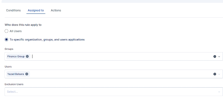 An administrator can further customize to whom the rule would be applicable by selecting user(s) or group of users in the "Assigned to" Tab, If the rule is to be applied to all the users then the "All Users" option need to be selected