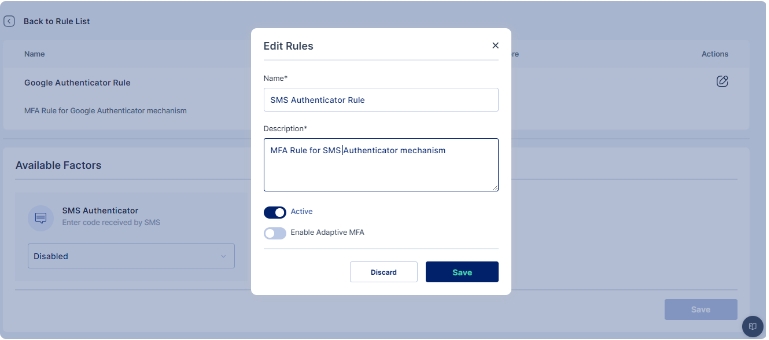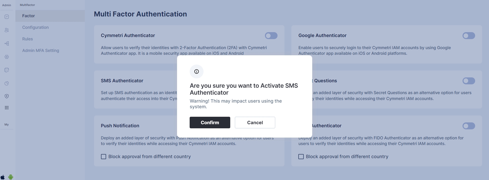 For configuring the SMS Authenticator, select the SMS Authenticator toggle button and click confirm to setup SMS Authenticator as an MFA option