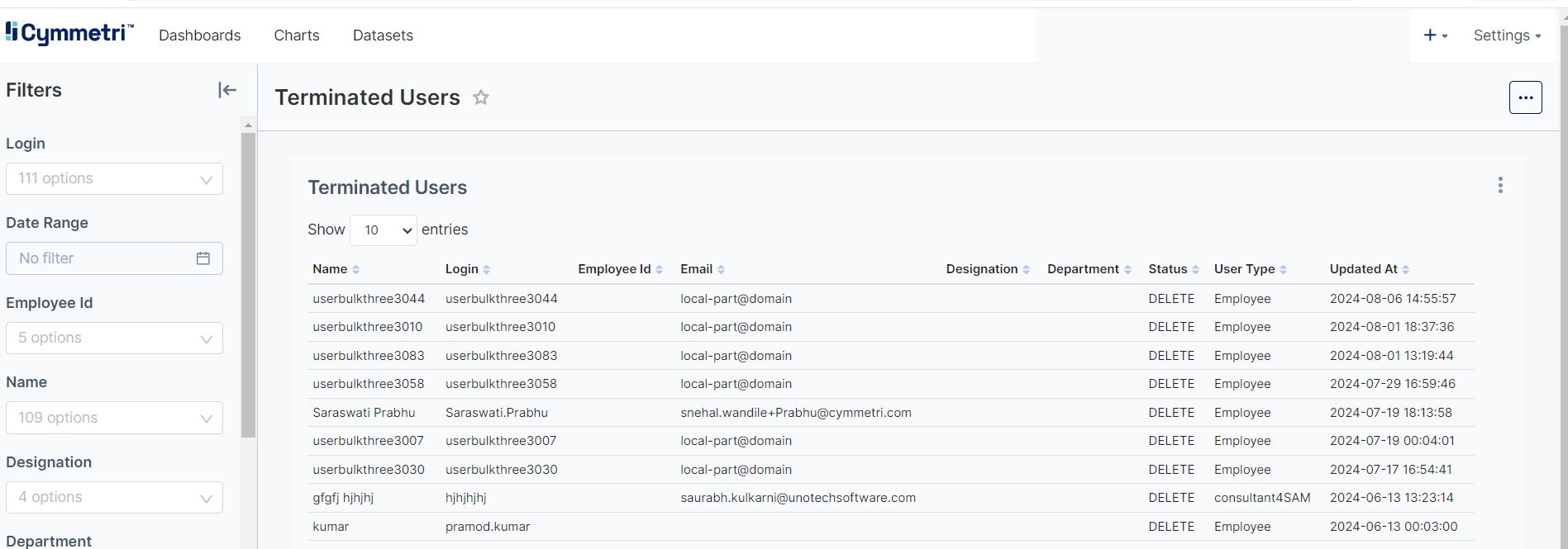 Lists all users within Cymmetri, including details such as Name, Login, Employee Id, Email, User Type, Updated At etc.