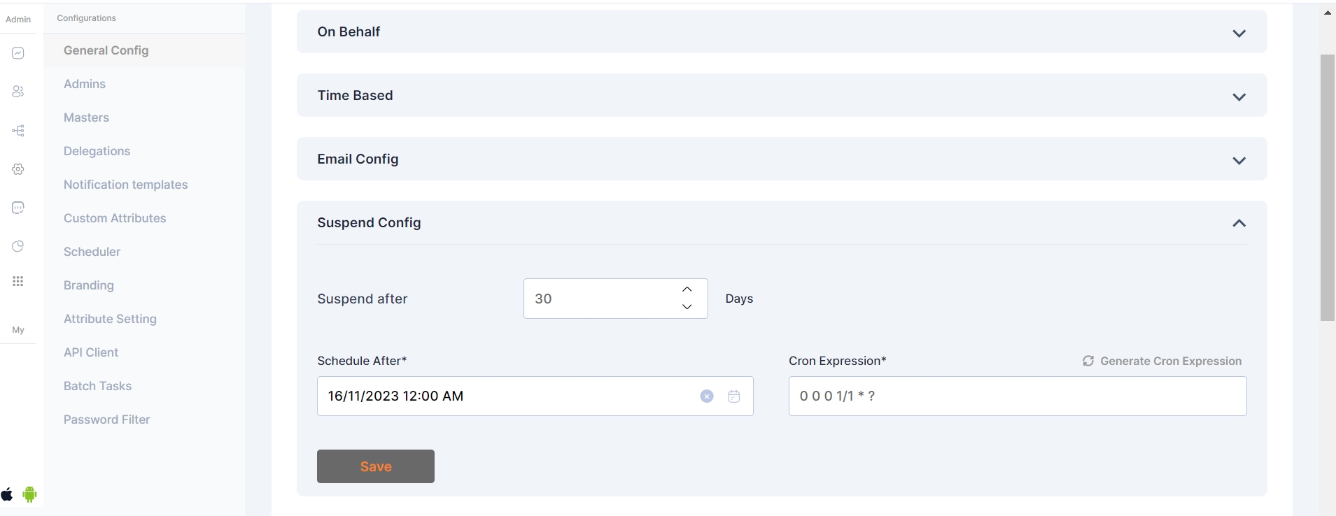Within the Suspend Config section, administrators have the ability to determine the duration a user remains in a suspended state before transitioning to the archived users' section. This can be specified using the "Suspend After" setting.