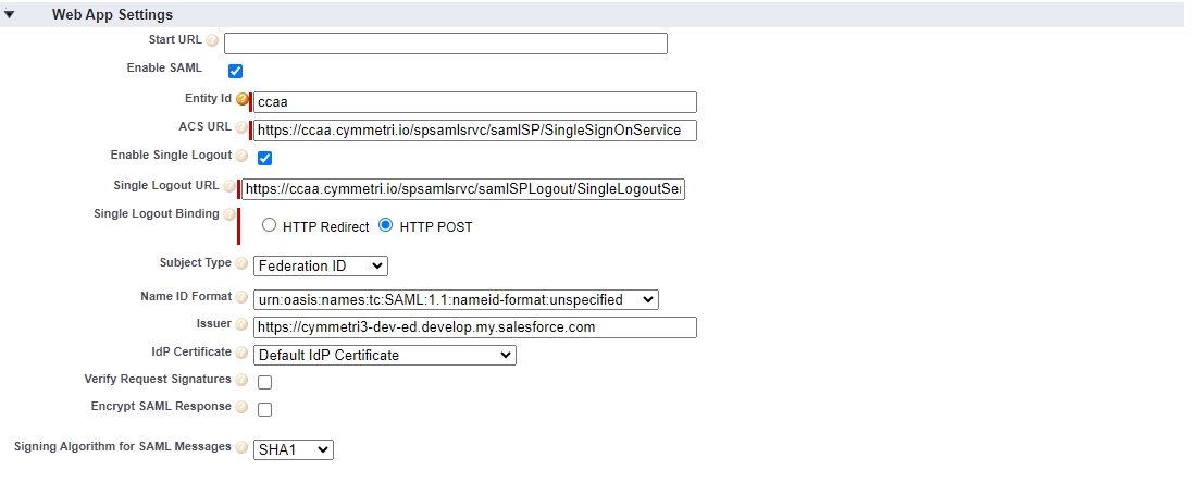 The above-mentioned details can be obtained by adding a service provider in Cymmetri as shown below. To know more about how to add a service provider in Cymmetri click here. Once created these details can be used in Salesforce as shown above.