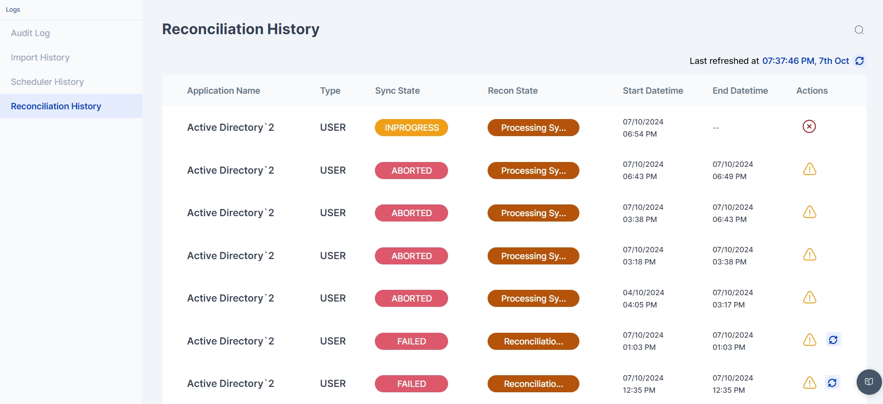 Reconciliation History provides a centralized dashboard for all system reconciliation jobs in one page. The relevant admin user can view the summary of all the tasks in progress, completed or aborted.