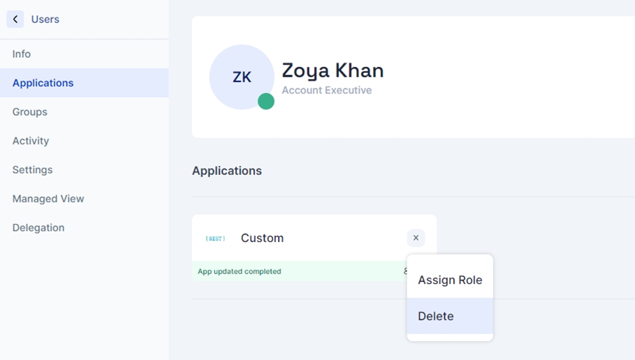 Go to the user to whom the application needs to be assigned. Click on the add new button. Now select the newly created application for provisioning and click on assign.