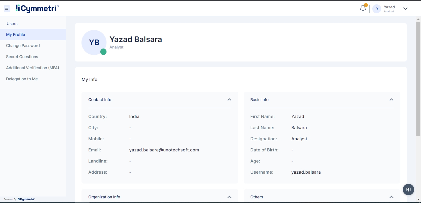 Using the Additional Verification(MFA) menu logged-In users can self manage their Multi-Factor Authentication options enabled by the Cymmetri Administrator. The user can see the list of available options and can remove and setup these options as needed.
