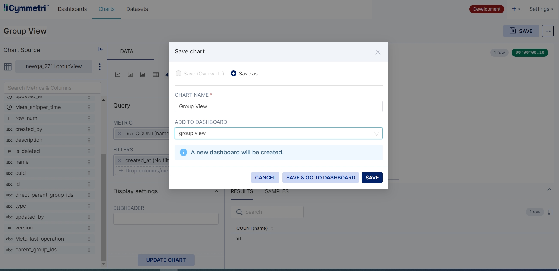 Note: If the chart is directly created and thereis no dashboard then the user has an option on the Save page to create a new dashboard.