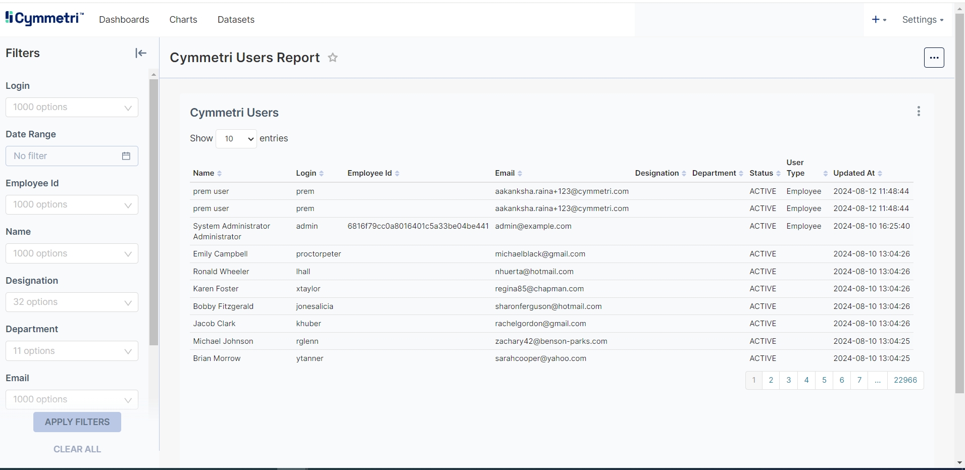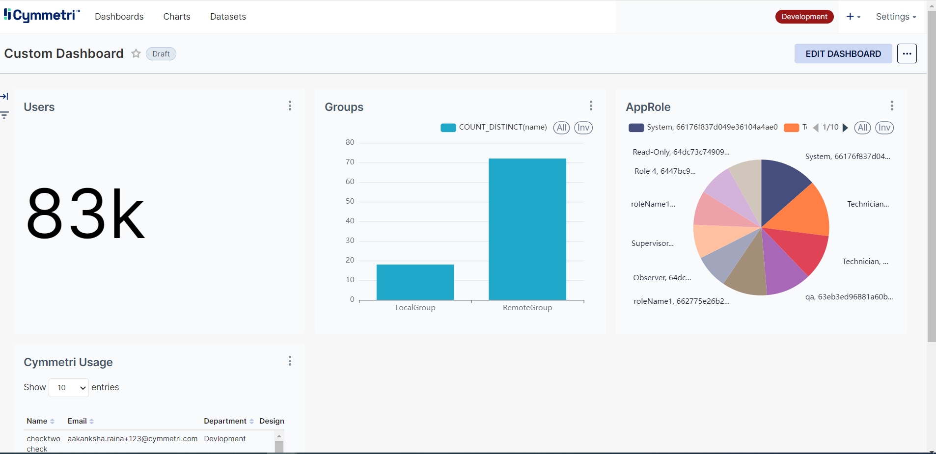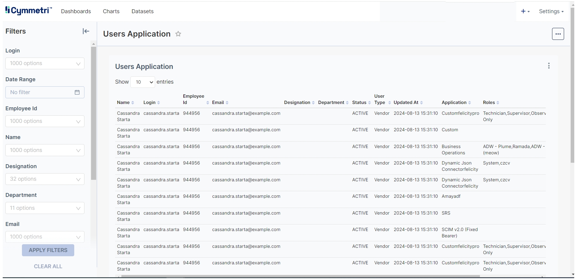 Cymmetri Identity Analytics is a comprehensive platform designed for identity and access management reporting. It is a component of Cymmetri's identity and access management (IAM) solutions that focuses on providing insights and analysis related to user identities, access patterns, groups, applications, other entitlements and security. It provides both out-of-the-box reports and the ability for end users to create custom reports and dashboards.