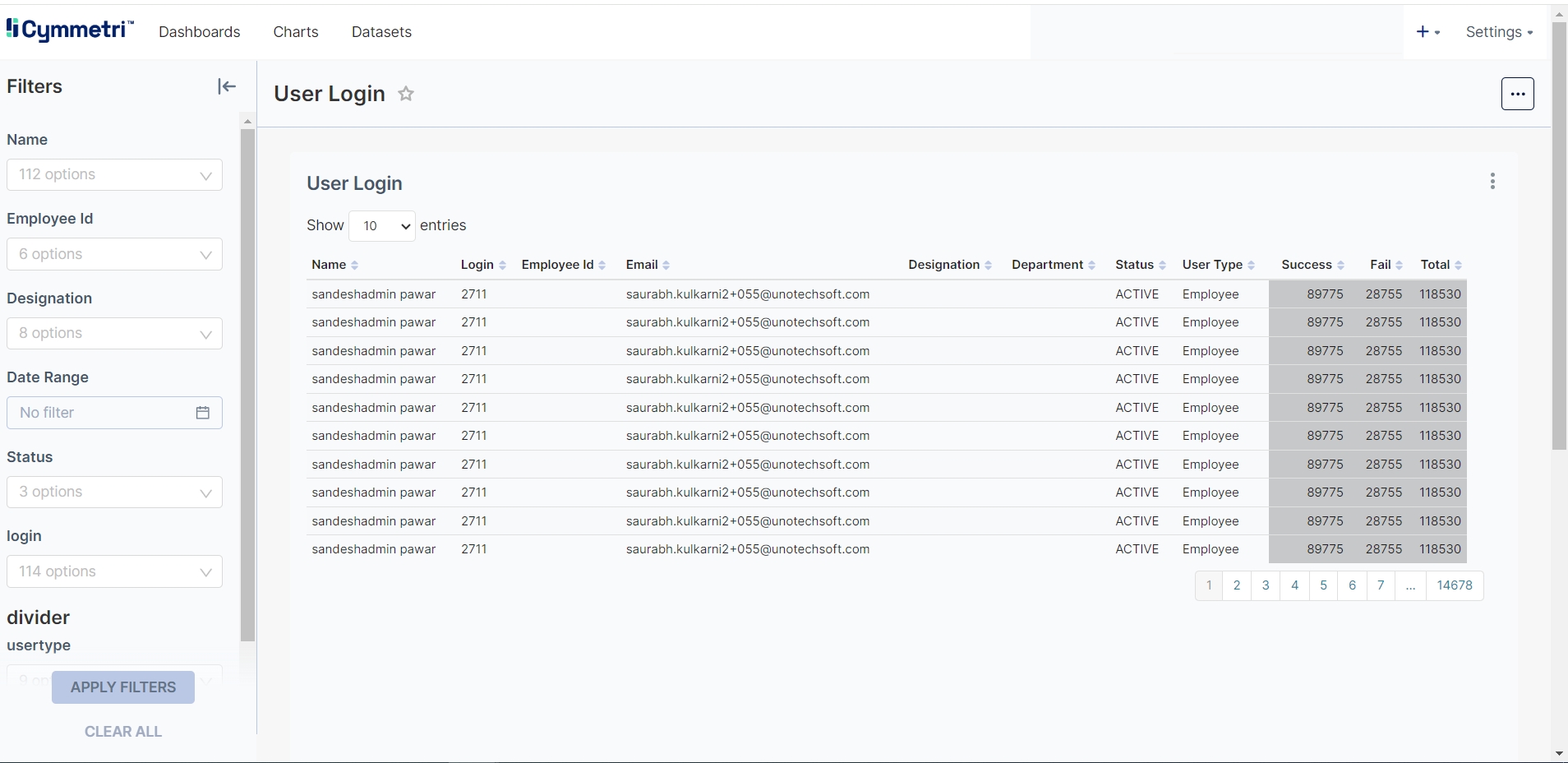 Tracks user login activities, including user type, number of successful and failed logins and total attempts to monitor access patterns and security.