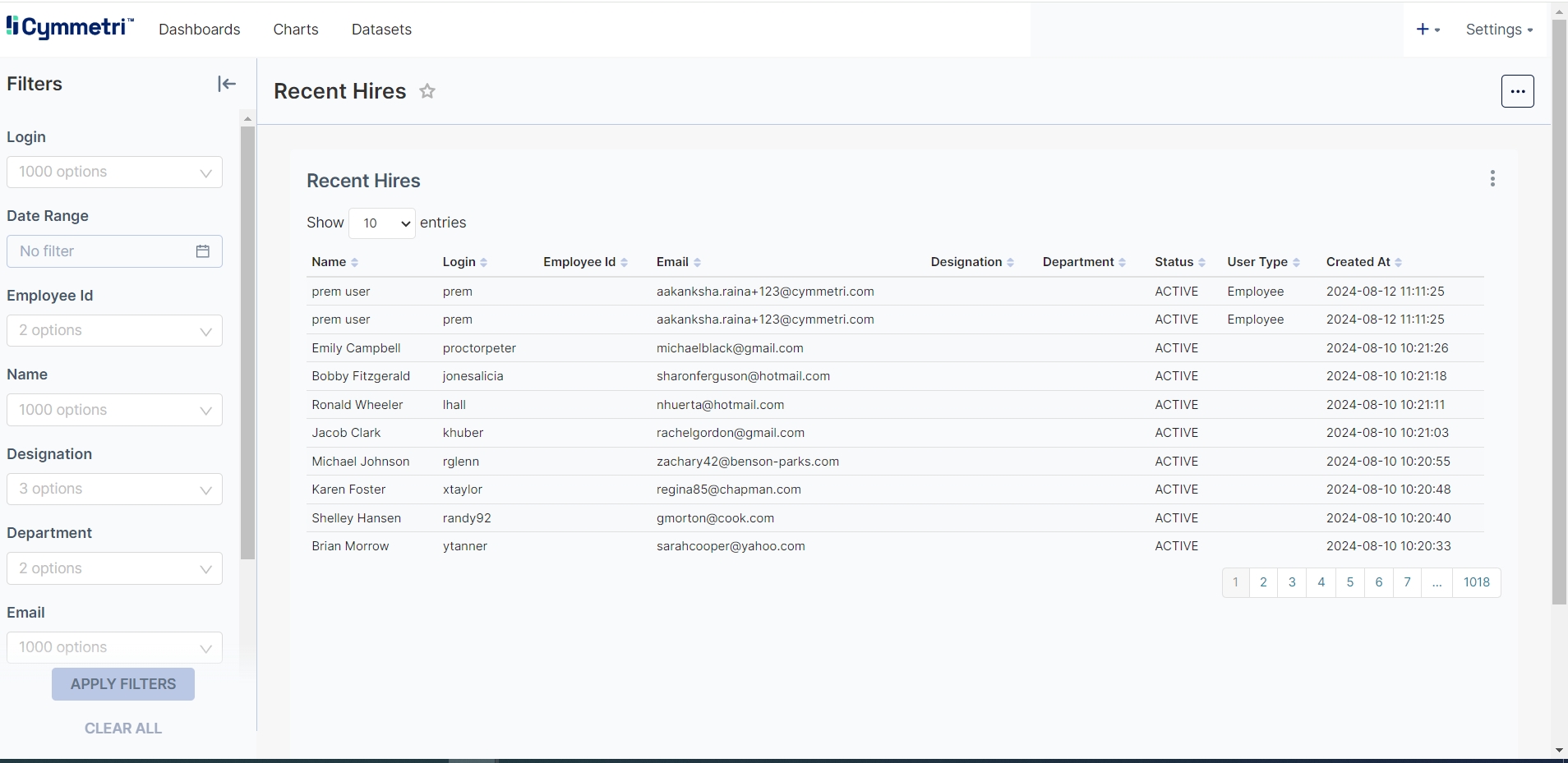 Lists all users within Cymmetri, including details such as Name, Login, Employee Id, Email, User Type, Updated At etc.