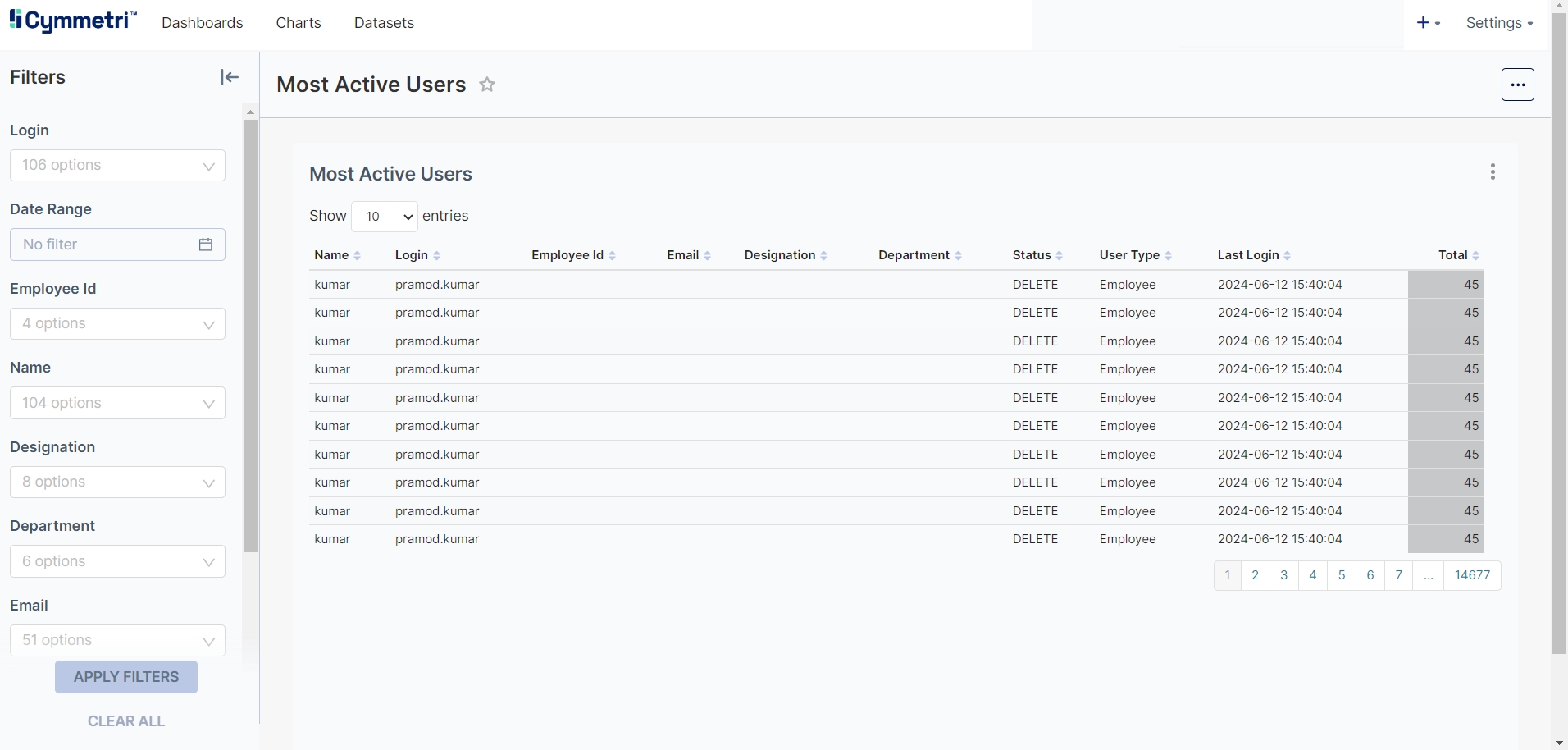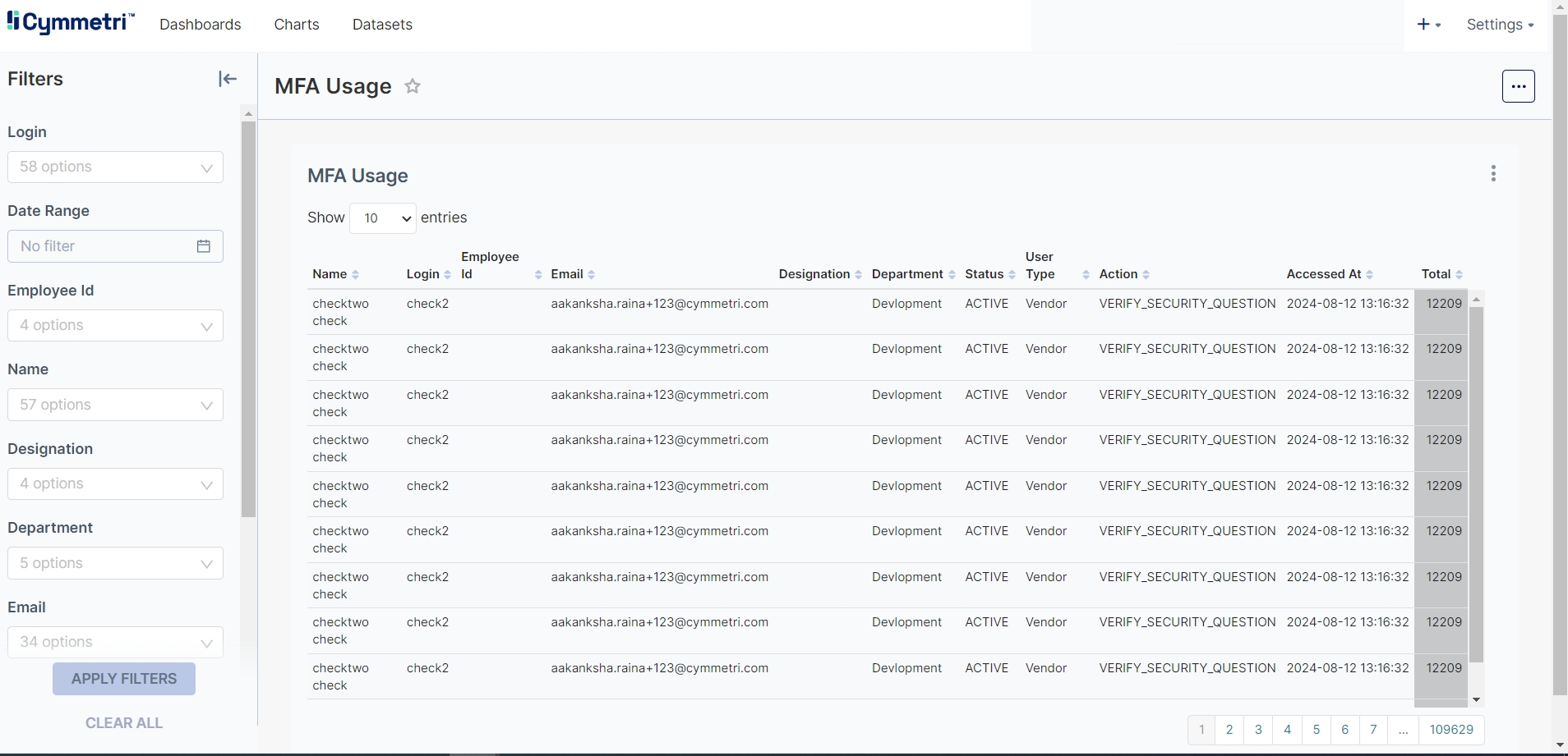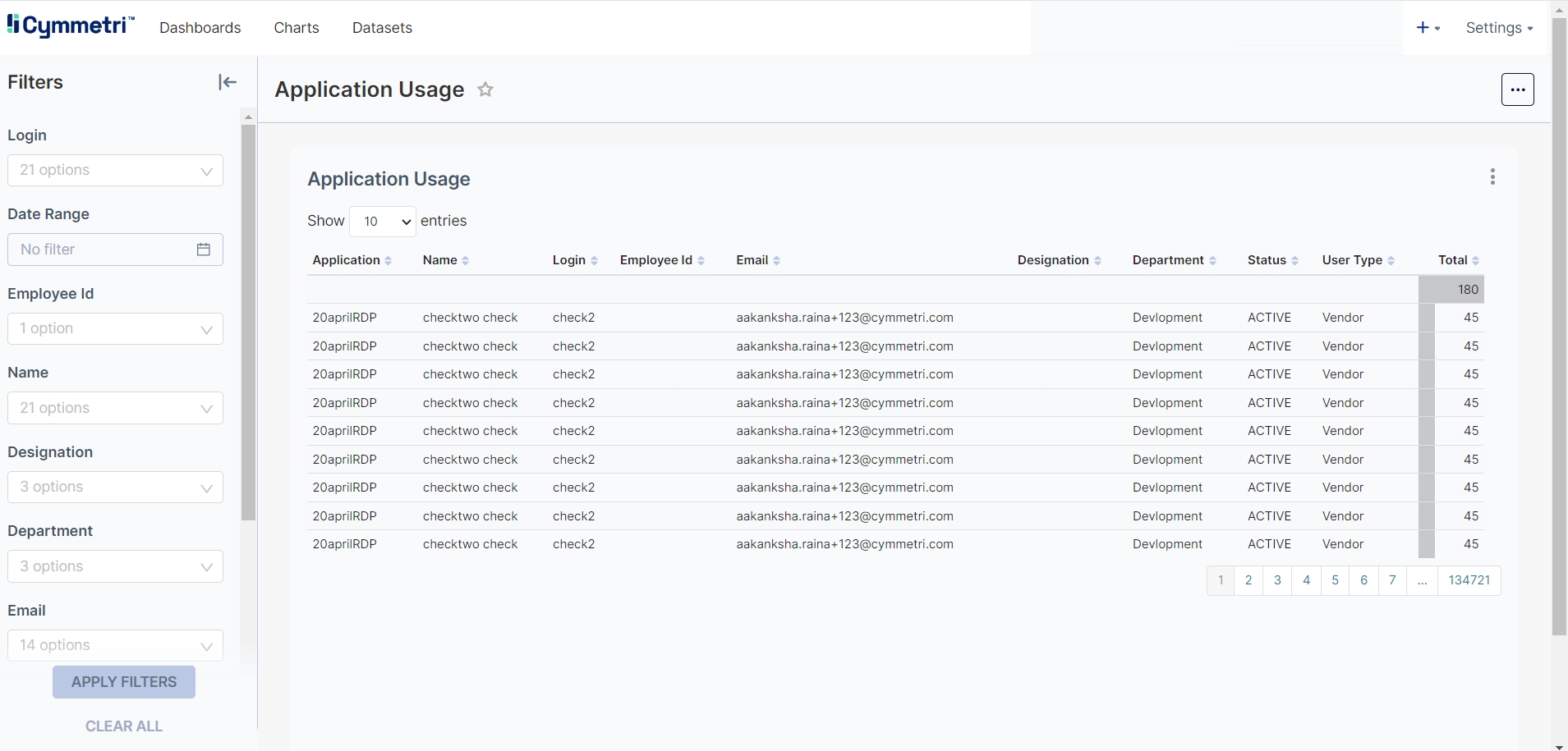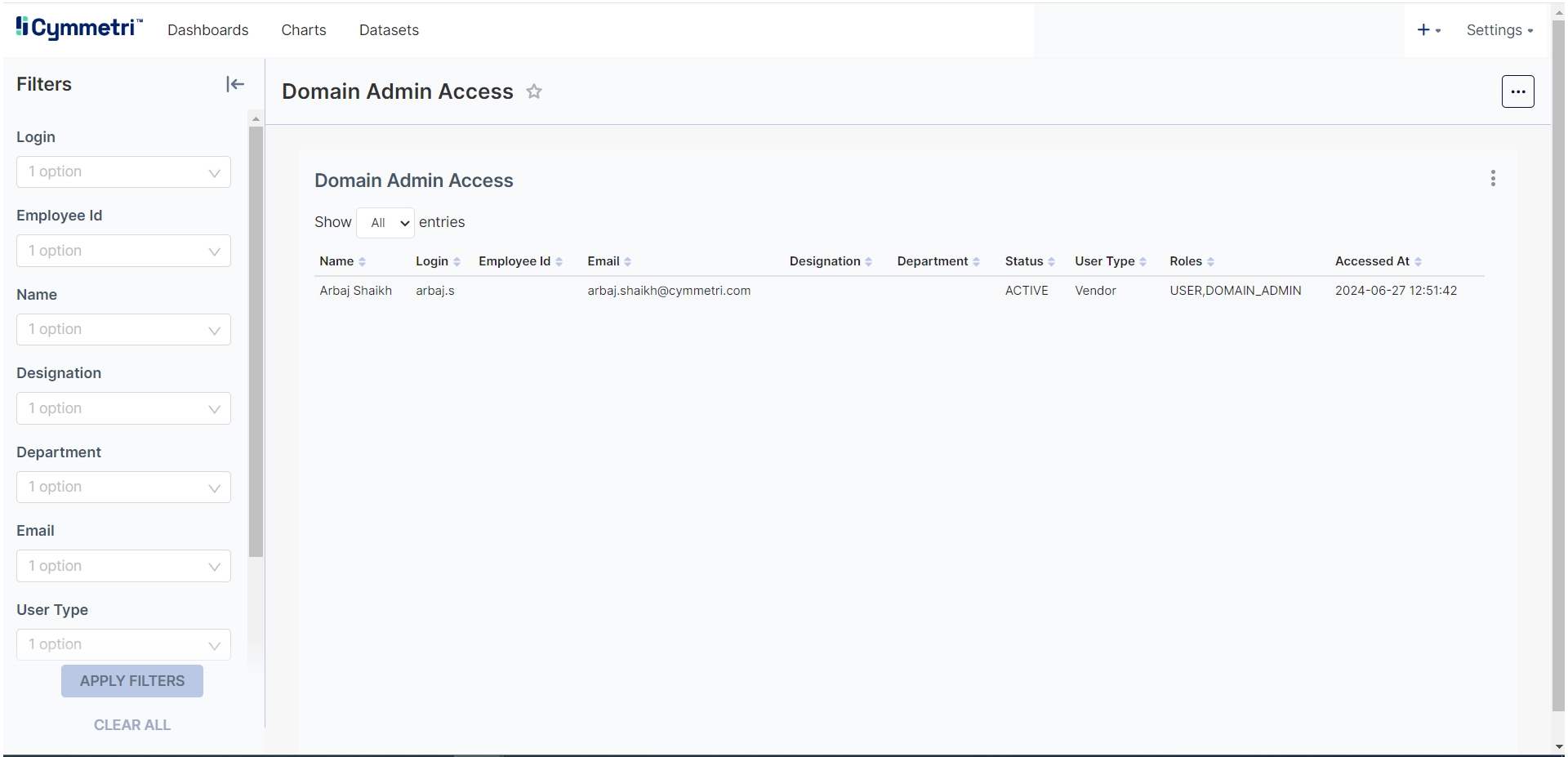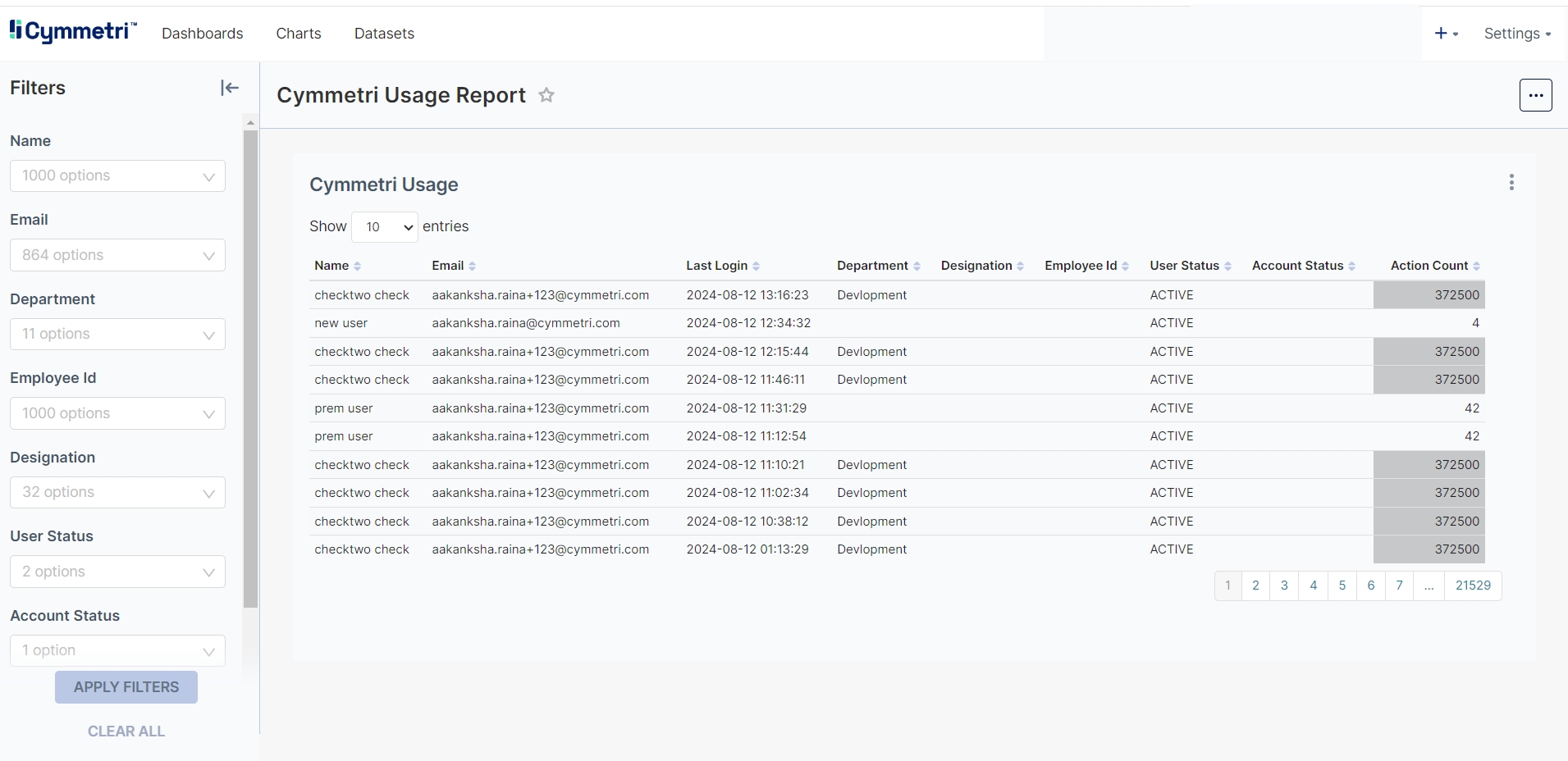 Offers insights into the overall usage patterns of Cymmetri, including user interactions and feature utilization. It provide a total count of the access done and actions performed by the users