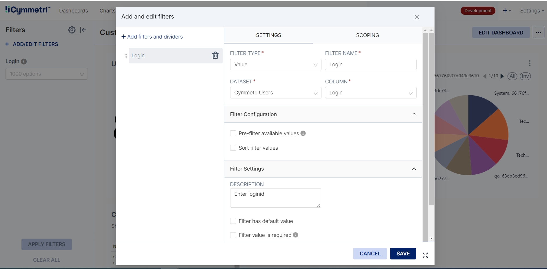 To these custom dashboards the user can add new or edit existing filters to further customize data as shown below: