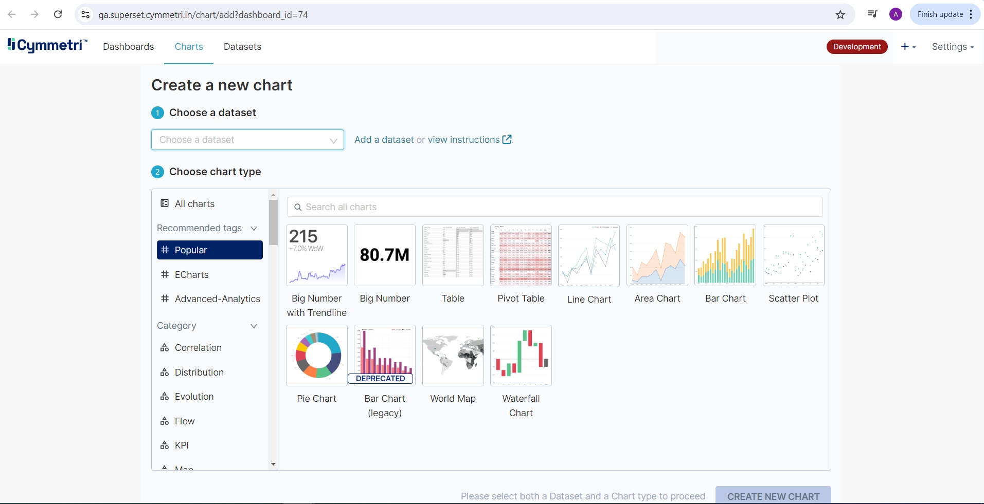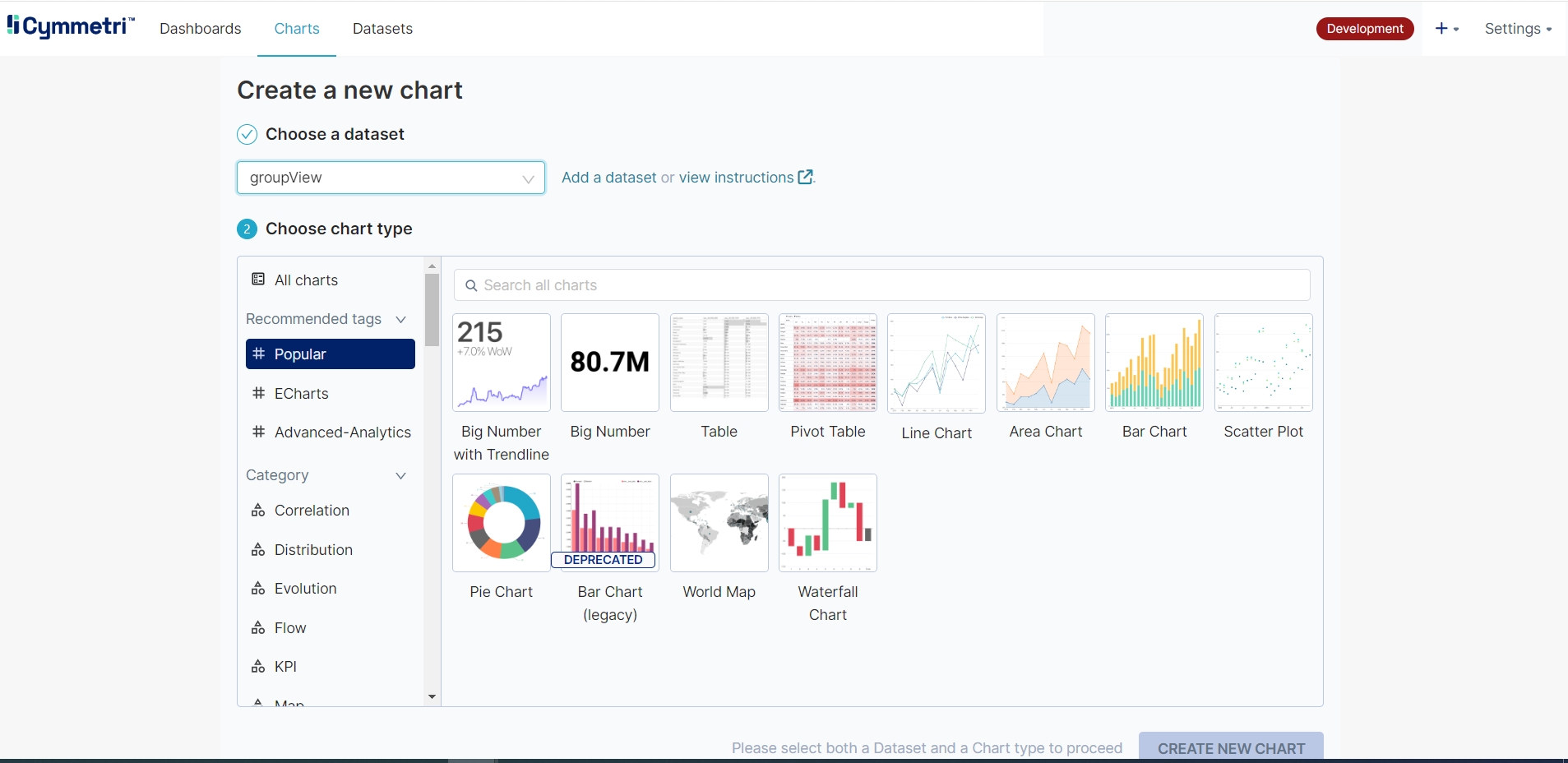 Once the dataset is either selected or a new dataset is created the user comes back to the Create Chart page where the user needs to select a chart type and the click on the CREATE NEW CHART button:
