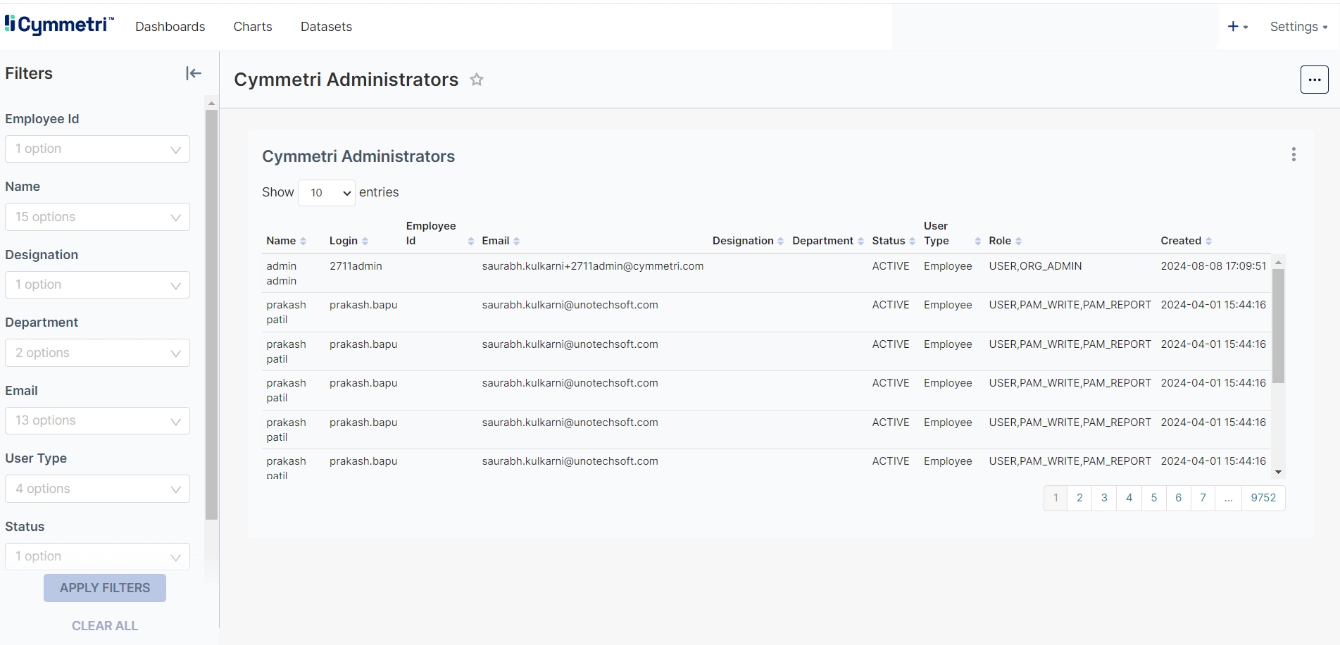 Provides information on users who have administrative privileges within Cymmetri. Useful for managing and auditing administrative roles.