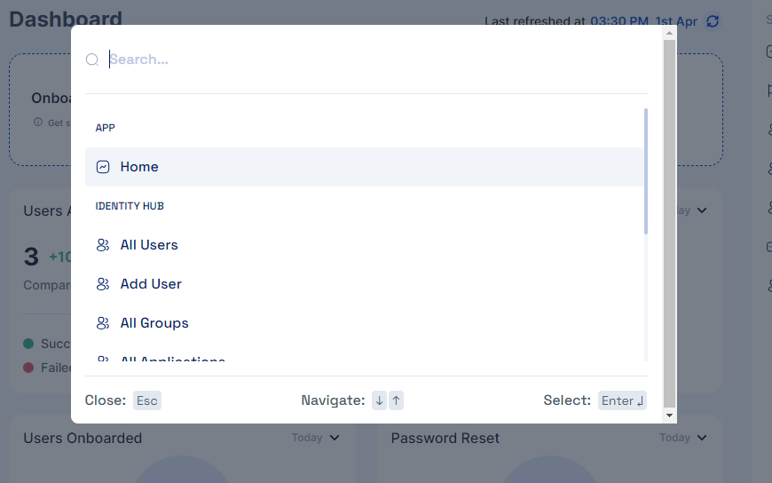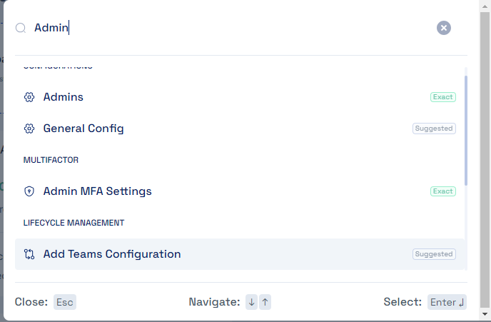 Upon entering a term, you'll receive precise matches or helpful suggestions. Simply browse the list and select the desired page to view it, clicking anywhere outside the search modal instantly closes it, allowing you to seamlessly return to your previous page.