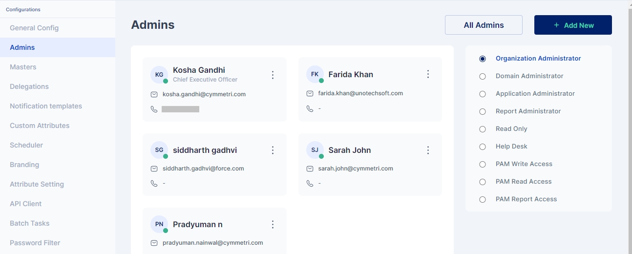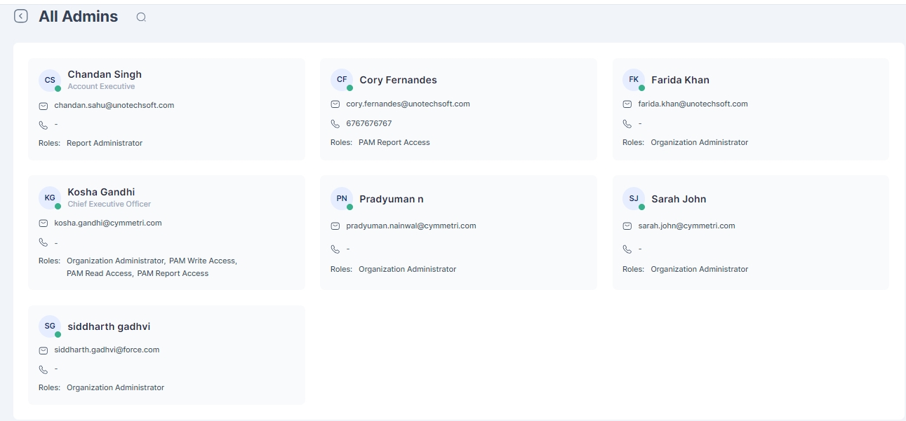 All admins is a section where various Cymmetri admins are displayed to the admin user