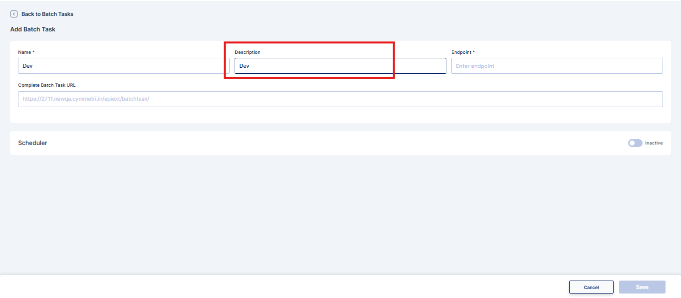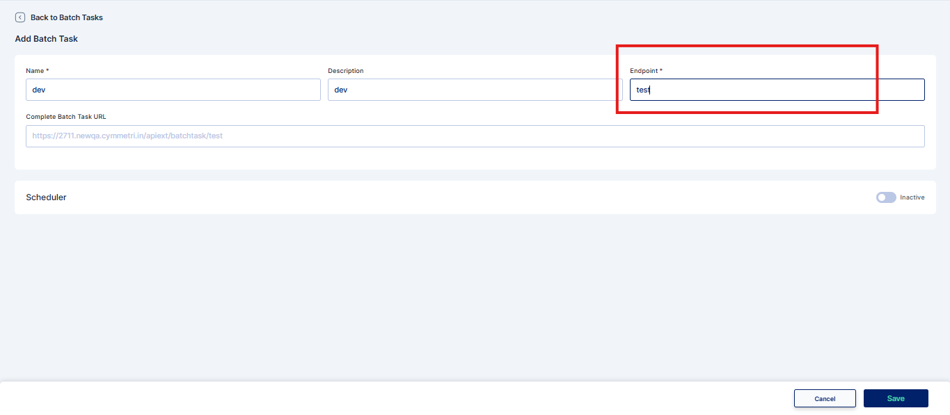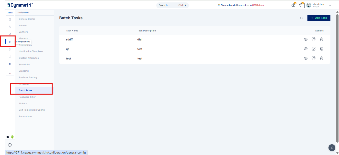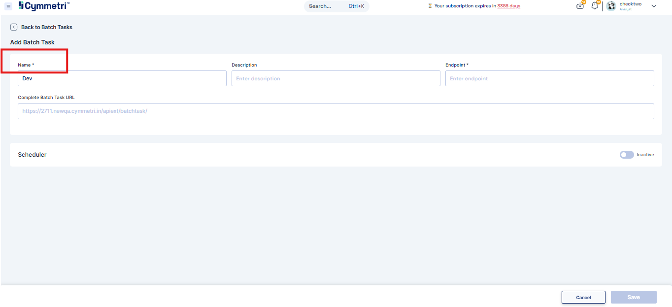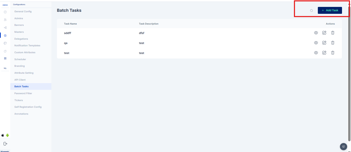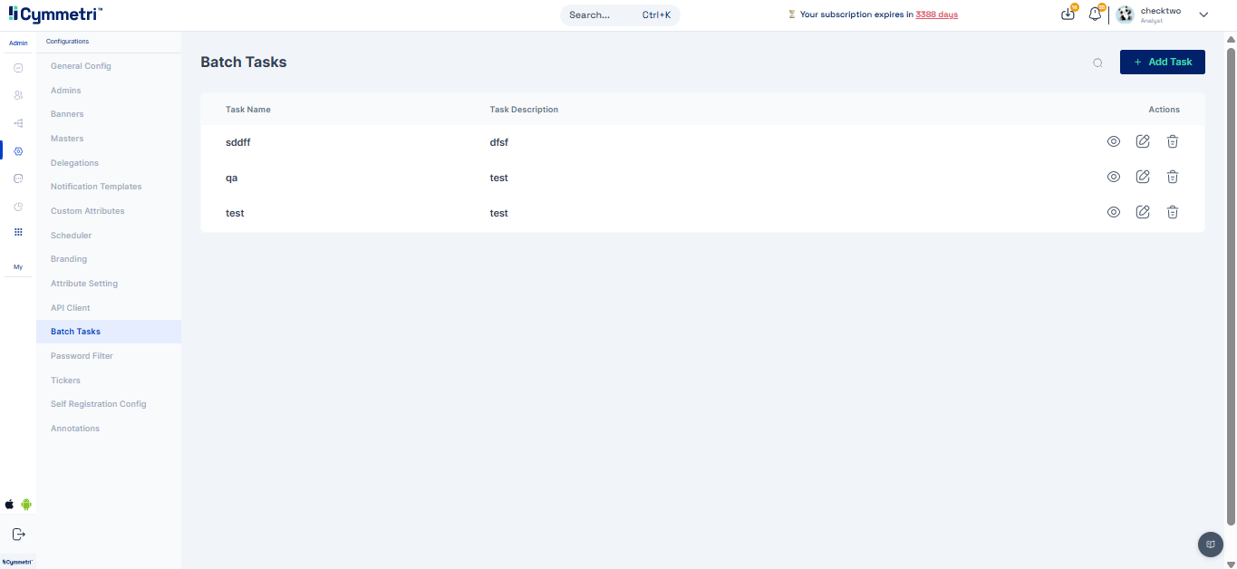 A Batch Task in Cymmetri is a configurable, automated job designed to perform bulk operations by executing a specific backend API endpoint. These tasks can be scheduled to run at predefined intervals or be triggered manually. They are commonly used for operations like data synchronization, user lifecycle management (e.g., deactivating inactive accounts), and report generation.