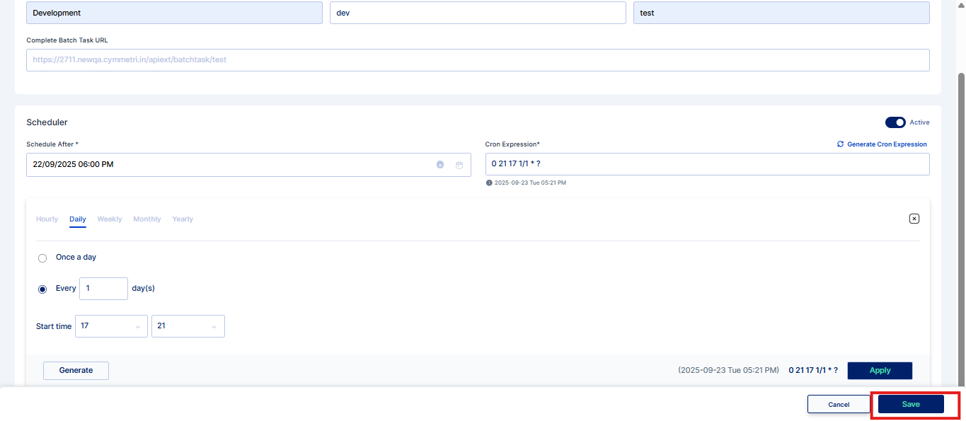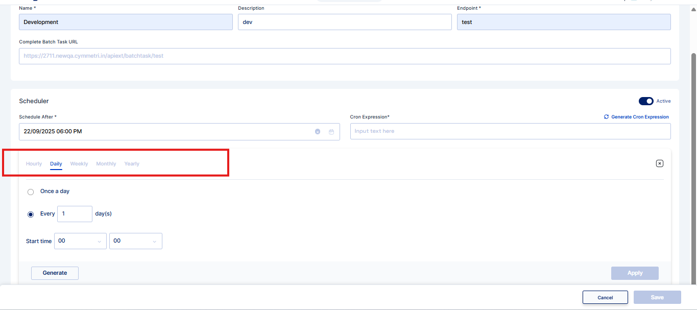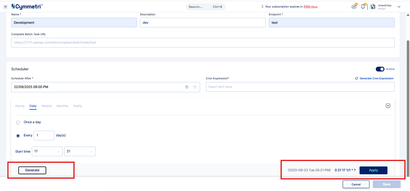 3. To generate a custom schedule, use the Generate Cron Expression tool, then click Generate and Apply.