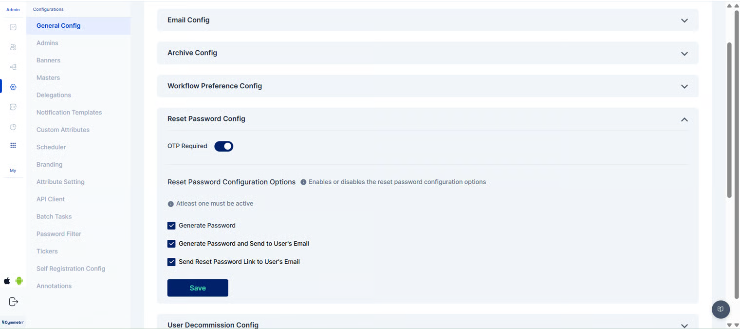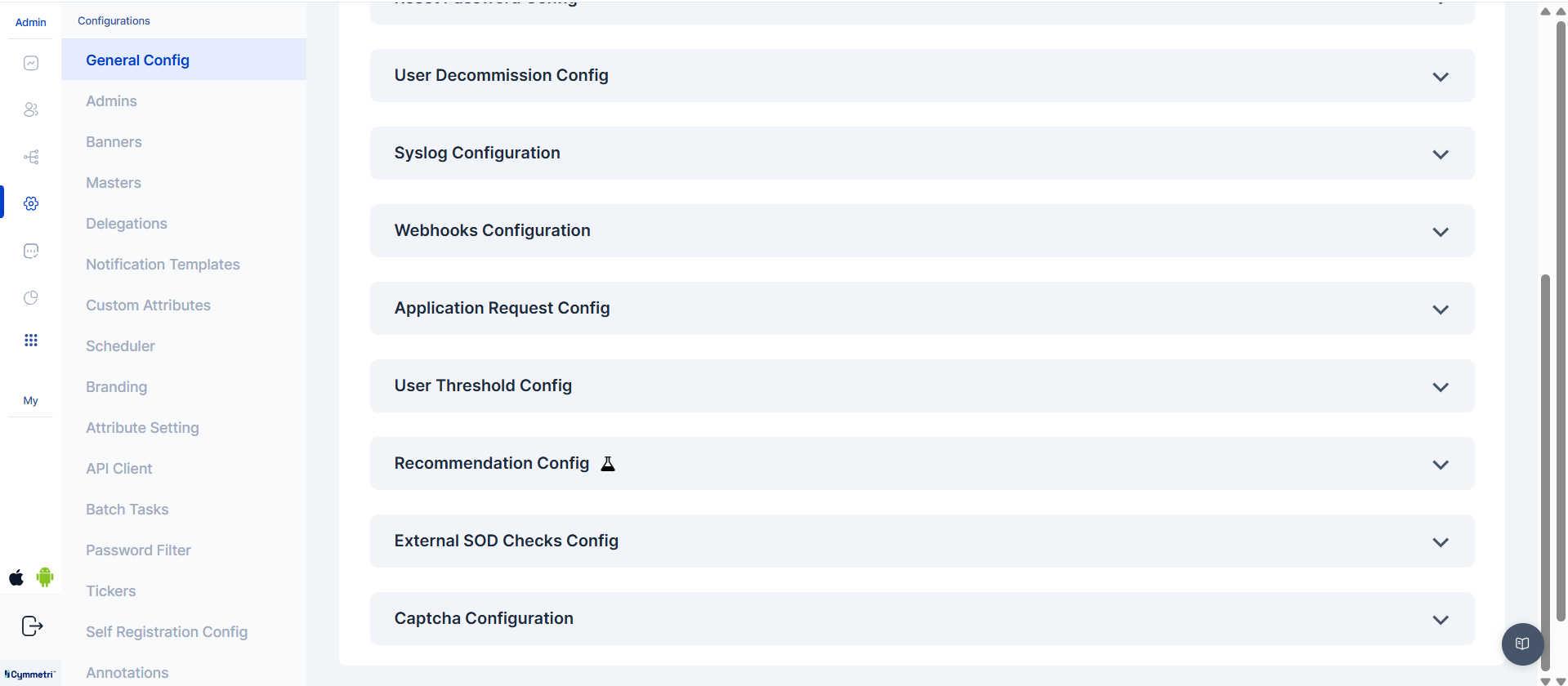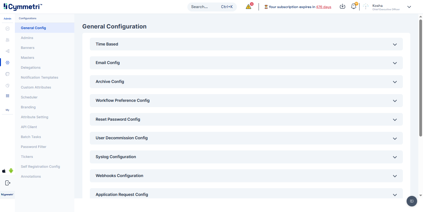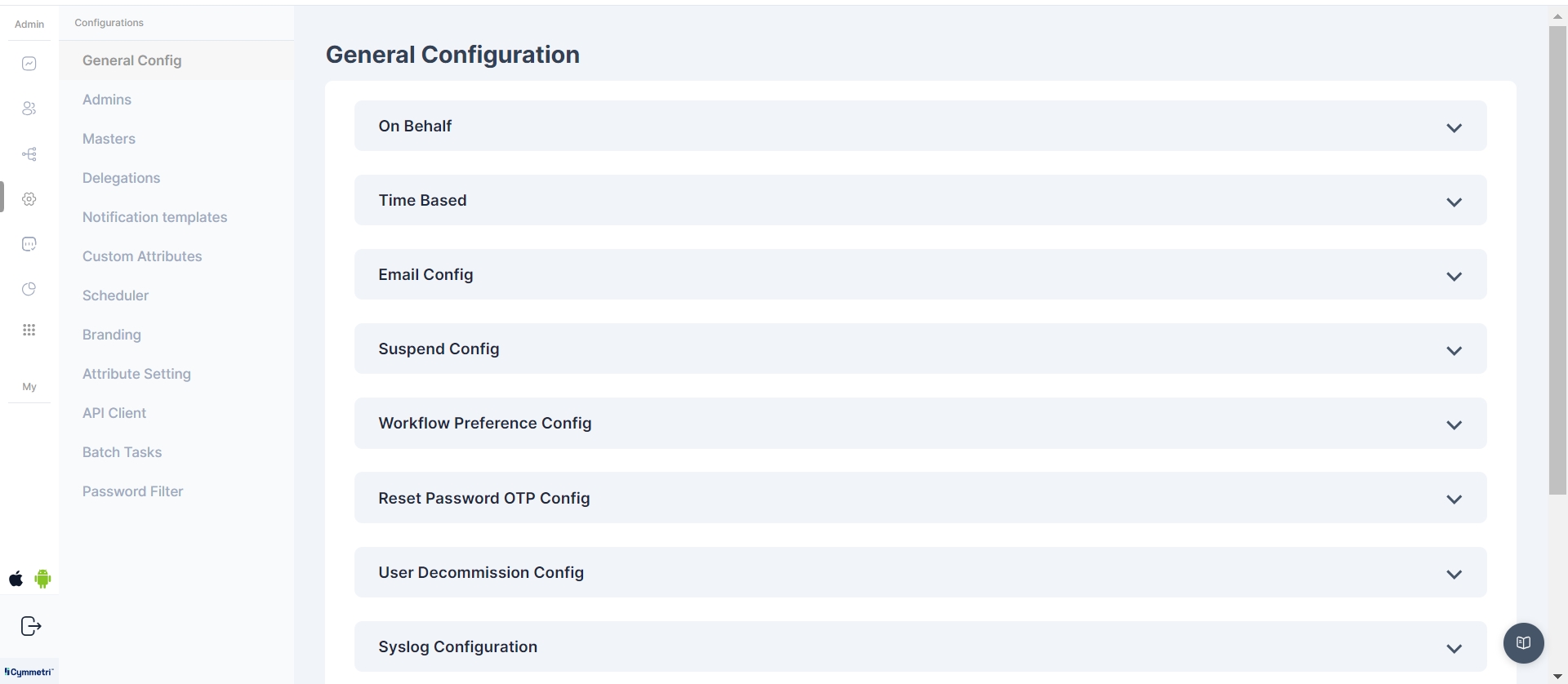 In this section within Cymmetri, a range of general or broad configuration settings and options are managed. These settings encompass various foundational configurations that affect the overall behavior of Cymmetri.