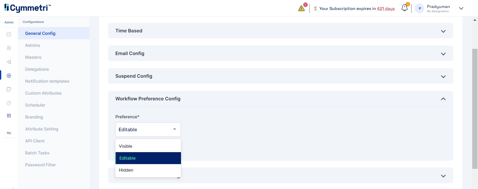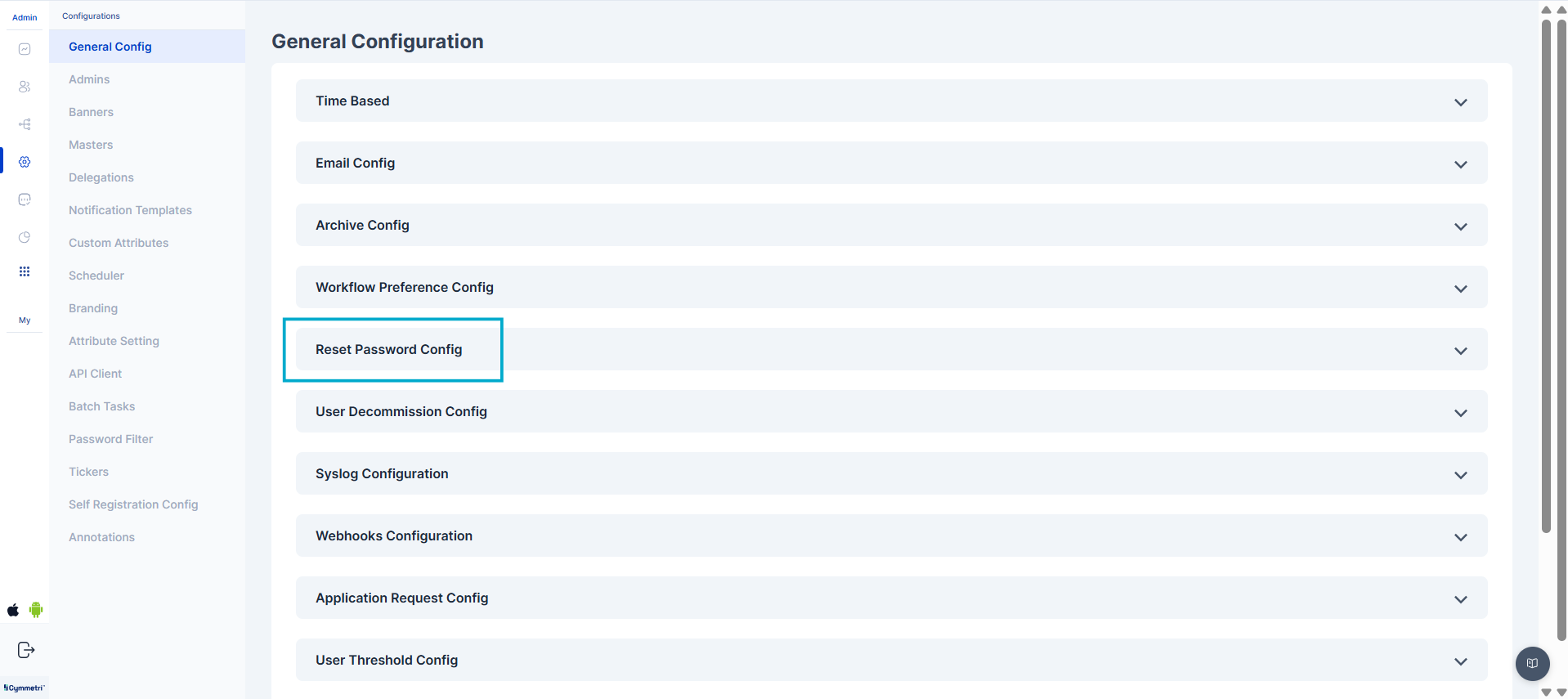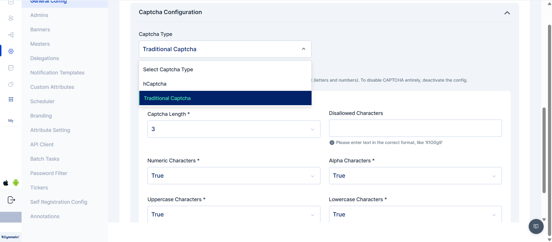 In this section within Cymmetri, a range of general or broad configuration settings and options are managed. These settings encompass various foundational configurations that affect the overall behavior of Cymmetri.