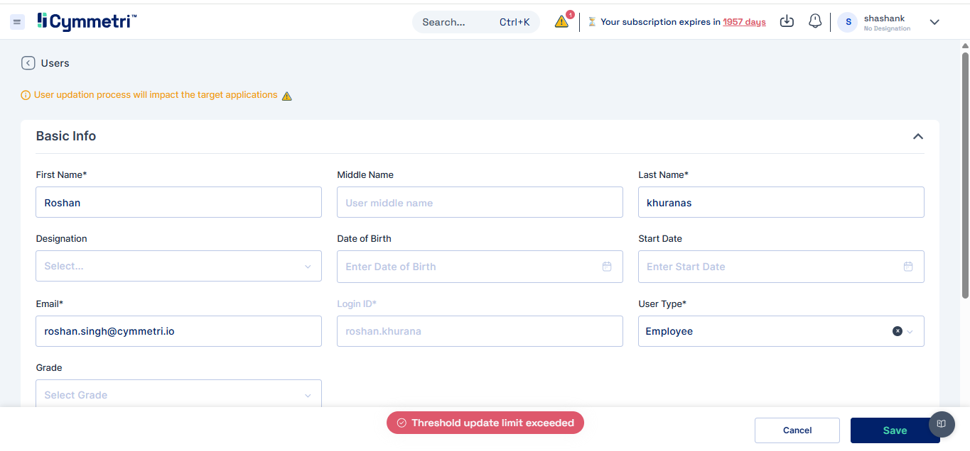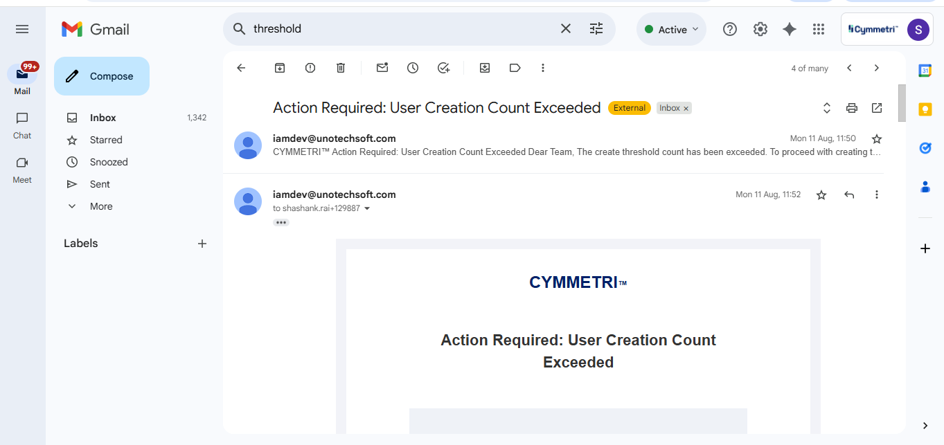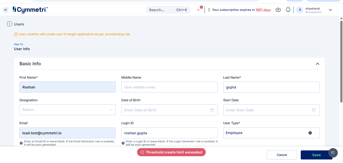 The User Threshold Config in Cymmetri primarily includes three key functions — Create Count, Update Count, Delete Count, and Send threshold notifications to. These define the maximum number of user creation, modification, and deletion operations permitted within the system in a single day, ensuring controlled provisioning and preventing unintended bulk changes.