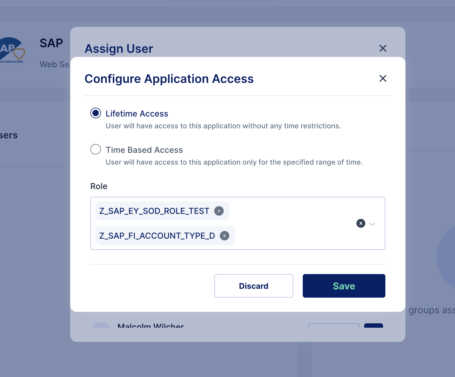**Application Assignment with role during External SOD Checks**: When a user is assigned an application along with a specific role, the system evaluates the assignment against configured External SoD rules.