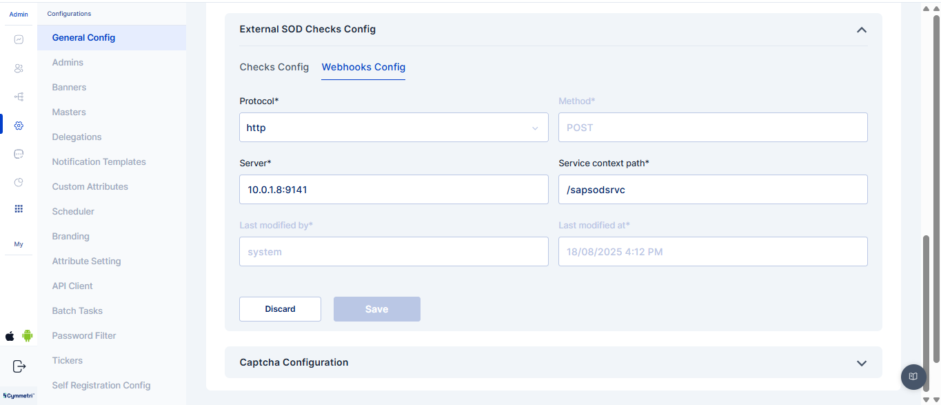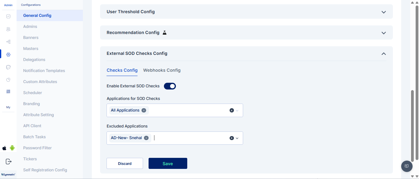 The External SoD Checks Config enables configuration of segregation-of-duties checks, webhook connections, and workflows to detect, notify, and manage access violations during application assignments. The Webhooks Config in Cymmetri’s External SoD Service is used to establish connections with external systems or services. It allows the platform to send real-time event notifications (such as SoD violations or workflow triggers) to defined webhook endpoints. When All Applications is selected, External SoD checks will run for every application, except those explicitly listed in the Excluded section, which will be ignored during violation detection.