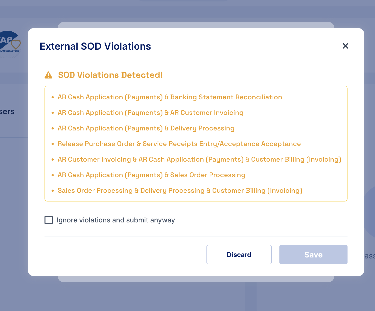 **Multiple SOD Violations Detected**: It indicates that a user’s application or role assignment has triggered more than one segregation-of-duties conflict, all of which are captured and sent for review through the workflow process.