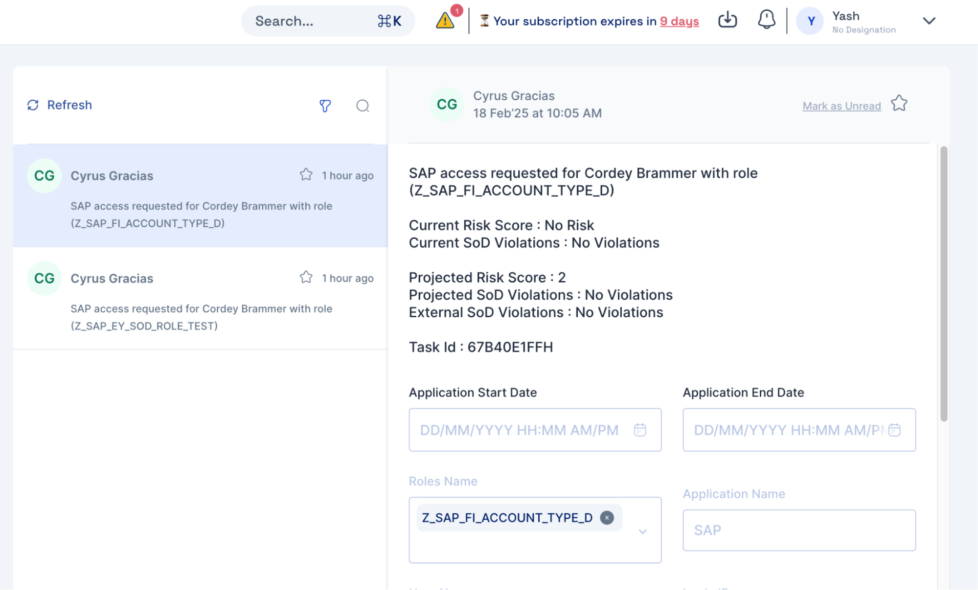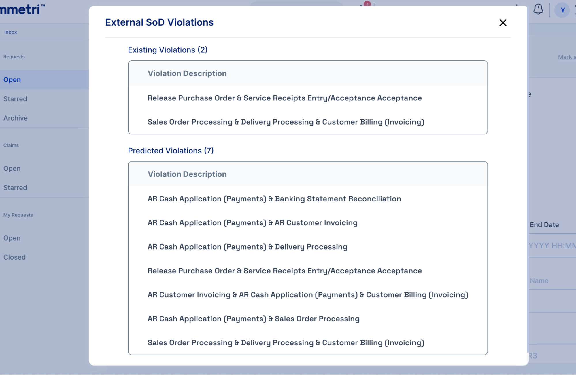 **Inbox Violations**: Segregation-of-duties conflicts detected during application or role assignments, which are delivered to the user’s or approver’s inbox for review and necessary action.