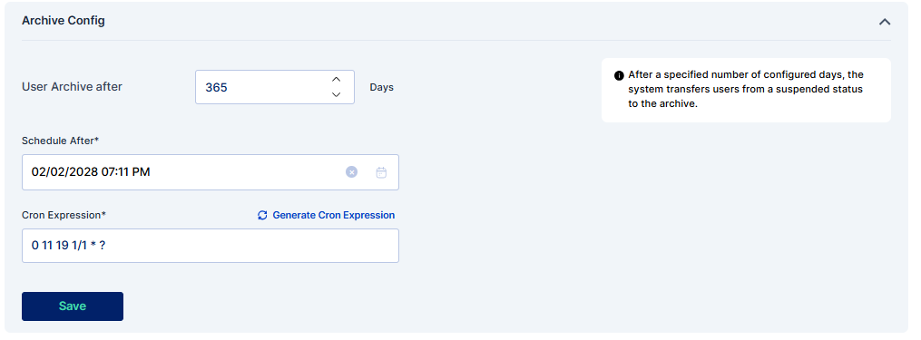 Within the Archive Config section, administrators have the ability to determine the duration a user remains suspended before transitioning to the archived users' section. This can be specified using the "Archive After" setting.