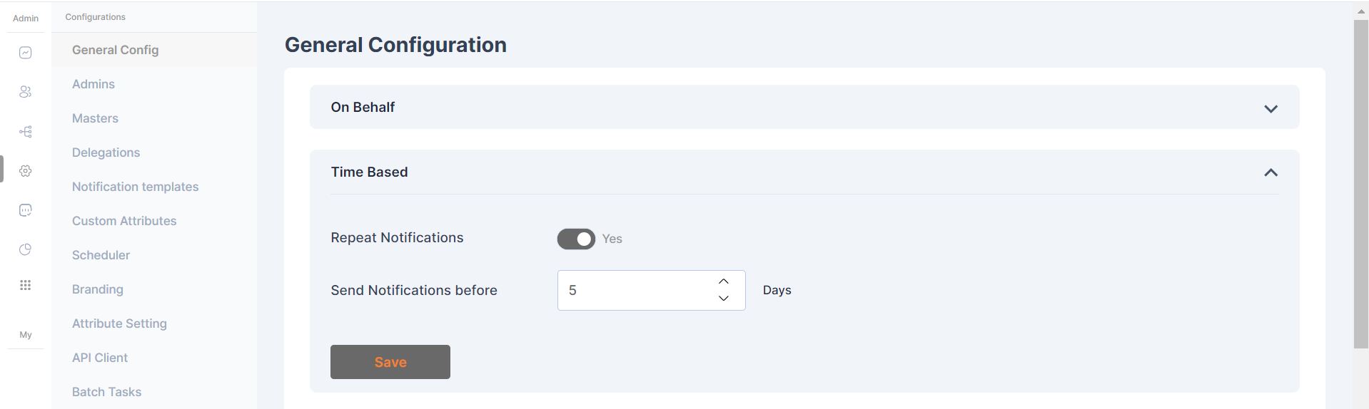 In the Time-Based configuration, system administrators can determine whether the system will send repeated notifications to users based on the number of days remaining, as specified in the 'Send Notifications before' field. This occurs when an application is assigned to the user as a time-based application and is about to expire.