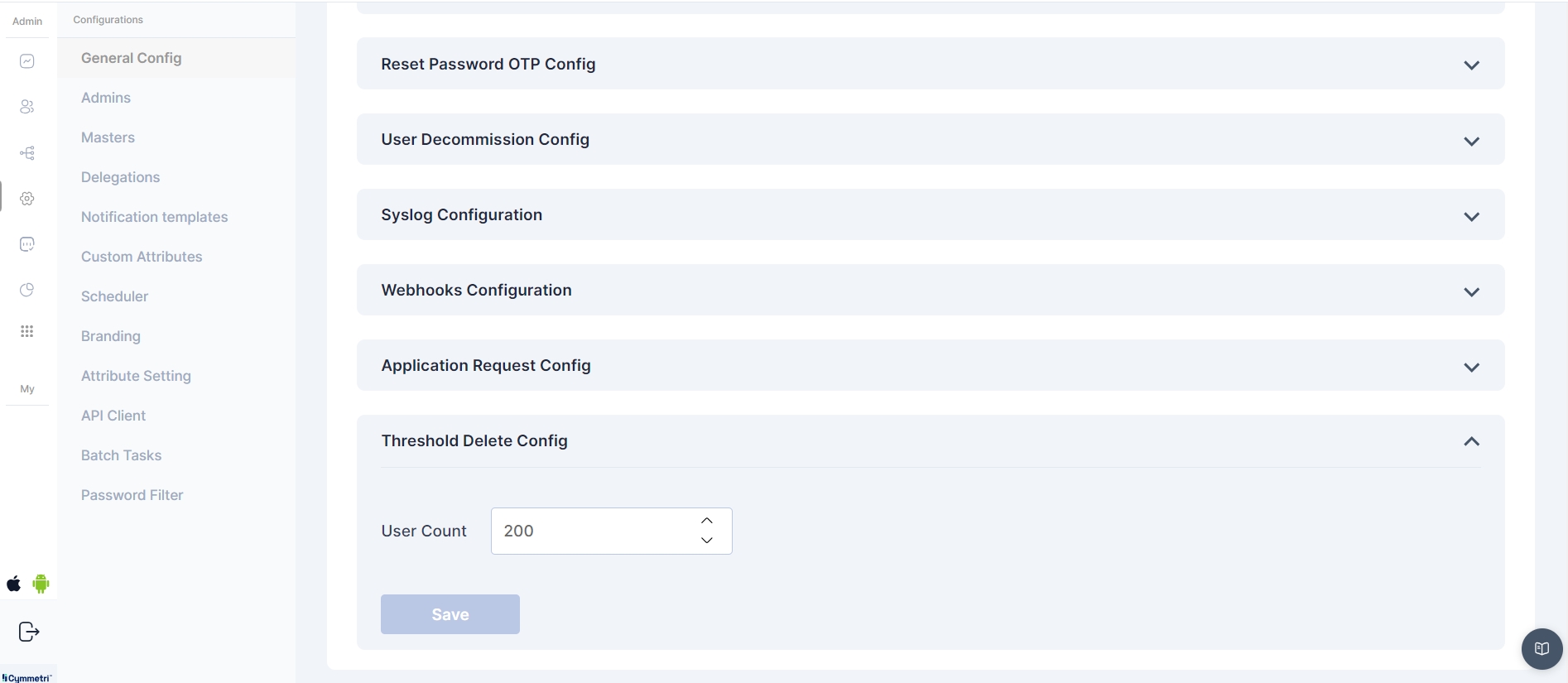 The Threshold Delete Config is a critical component in Cymmetri, governing the maximum number of users that can be deleted from the system in a single day.