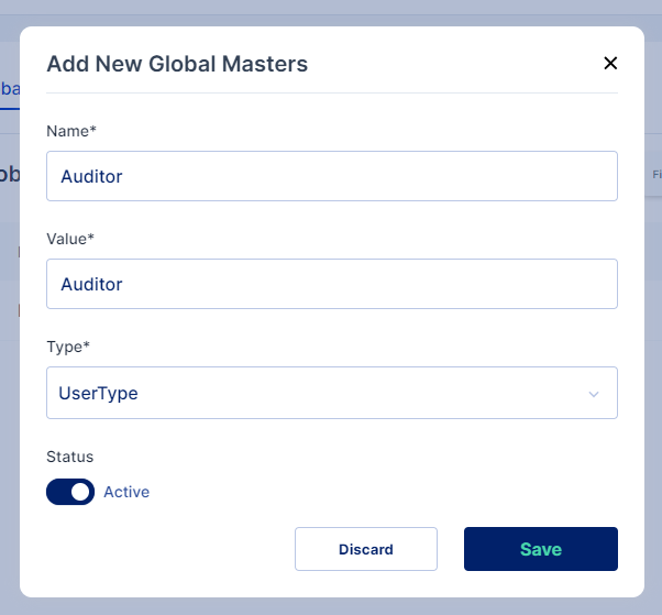 Enter the Name and Value for the new Master, then select the type of master you wish to create and enable the active toggle button to make the master active. Once all values are entered, click on the **Save** button