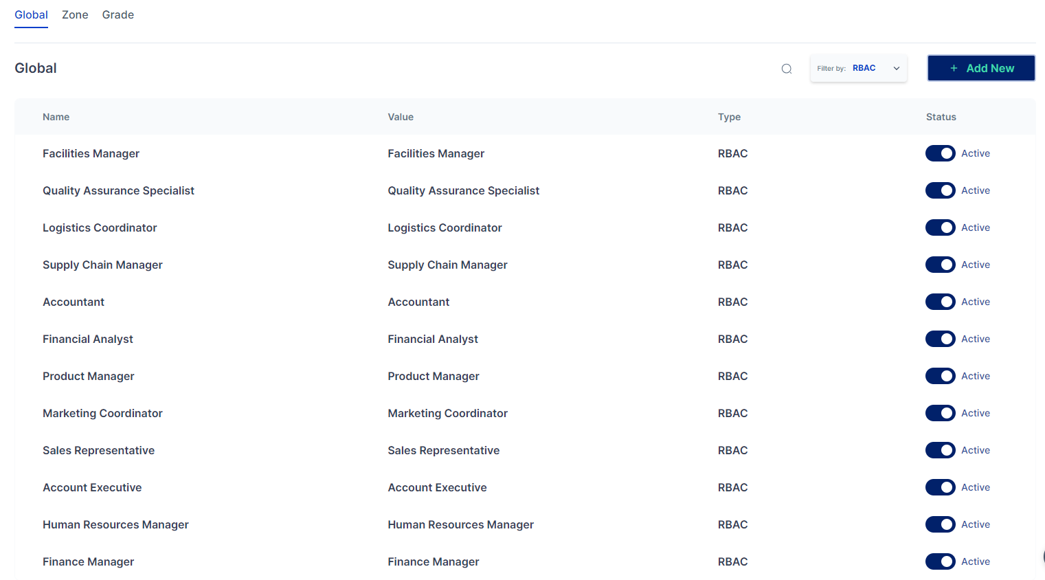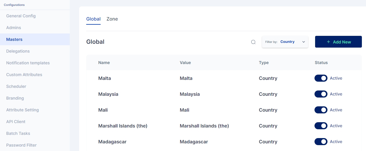 Cymmetri platform allows for configuring several masters in the system, the major classification among which are Global masters (which allow for creating master key-value pairs that may be used for various situations, such as creating a new department, designation, and other custom attributes for users in the system) and Zone masters (which are network configurations that may be used to whitelist or blacklist user access onto the platform as well as act as a source for adaptive Multi-factor authentication).