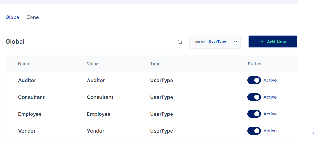 <table data-full-width="true"><thead><tr><th width="146">Type</th><th>Description</th></tr></thead><tbody><tr><td><strong>Country</strong></td><td>Country key-value pairs are stored in the system, and are available as drop-downs wherever needed in the system - User attributes, Policies and other mappings.</td></tr><tr><td><strong>UserType</strong></td><td>UserType is used as one of the conditions while defining authentication policies and as an input in the rule engine.</td></tr><tr><td><strong>Department</strong></td><td>Department is used as one of the conditions while defining authentication policies and as an input in the rule engine, and also as a user attribute.</td></tr><tr><td><strong>Designation</strong></td><td>Designation is used as one of the conditions while defining authentication policies and as an input in the rule engine, and also as a user attribute.</td></tr><tr><td><strong>RBAC</strong></td><td>RBAC (System Roles) is used as one of the conditions while defining authentication policies and as an input in the rule engine, and also as a user attribute.</td></tr></tbody></table>