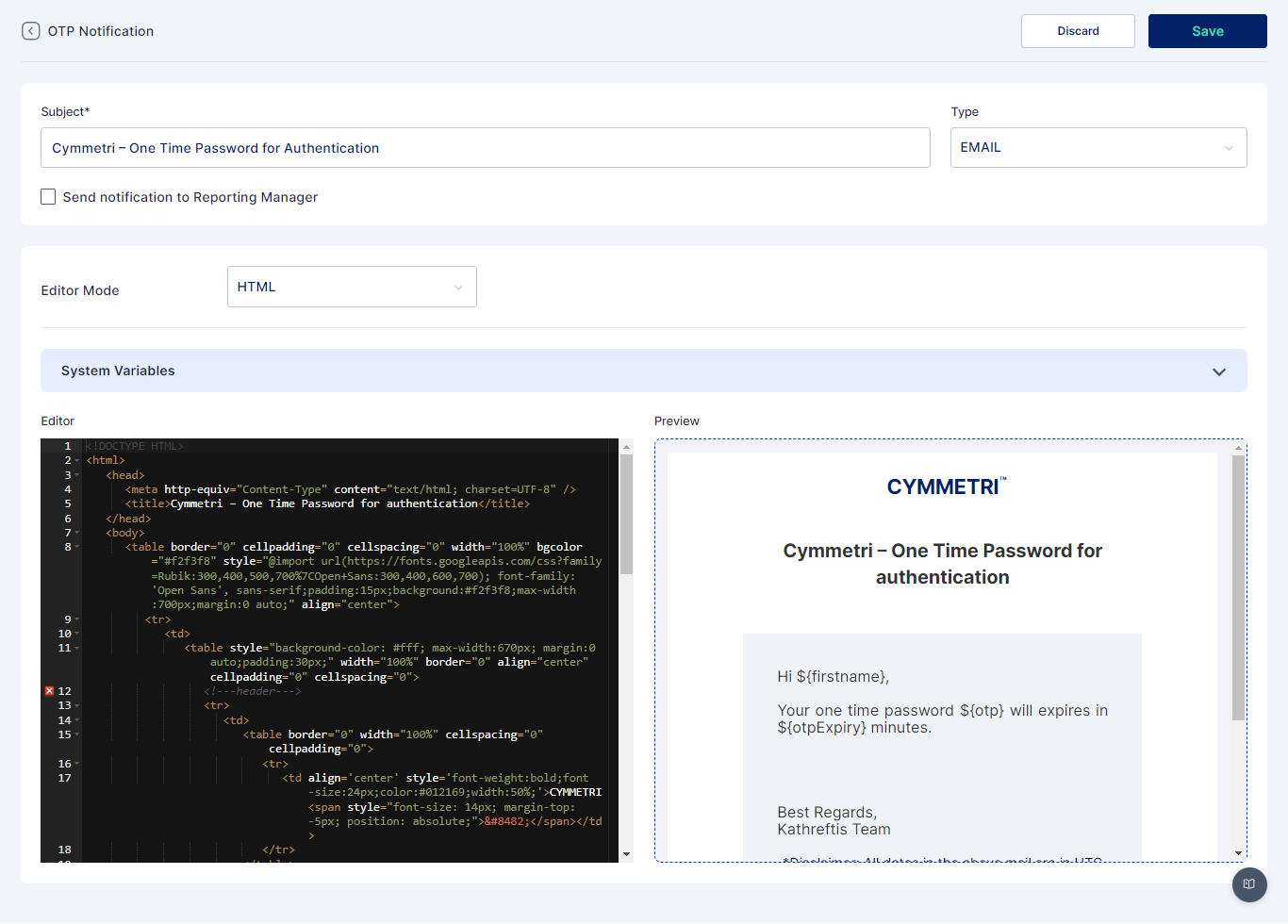 6. The administrator may edit the HTML using the provided HTML editor to add/change any template button/text/background. The macros required for the particular template are already provided in the sample default notification template.