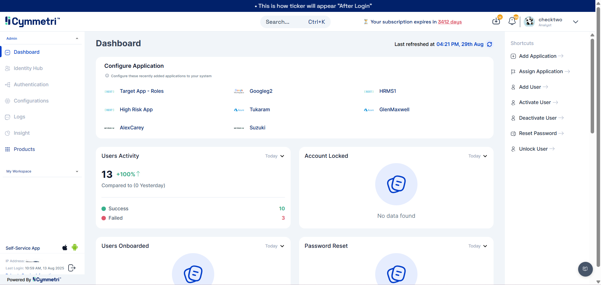 The Ticker feature is a powerful communication tool in the Cymmetri platform that allows administrators to broadcast real-time, time-sensitive, text-based messages to users. It's a key component for improving internal communication and enhancing security awareness.