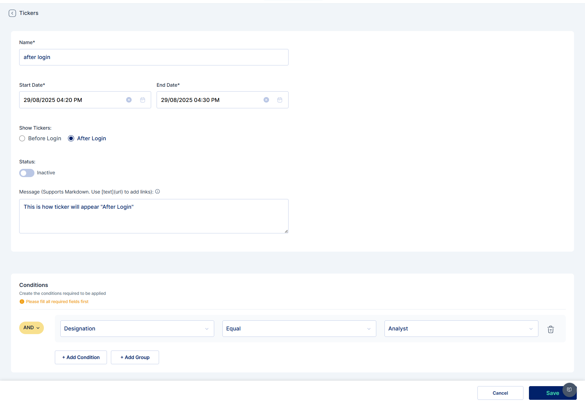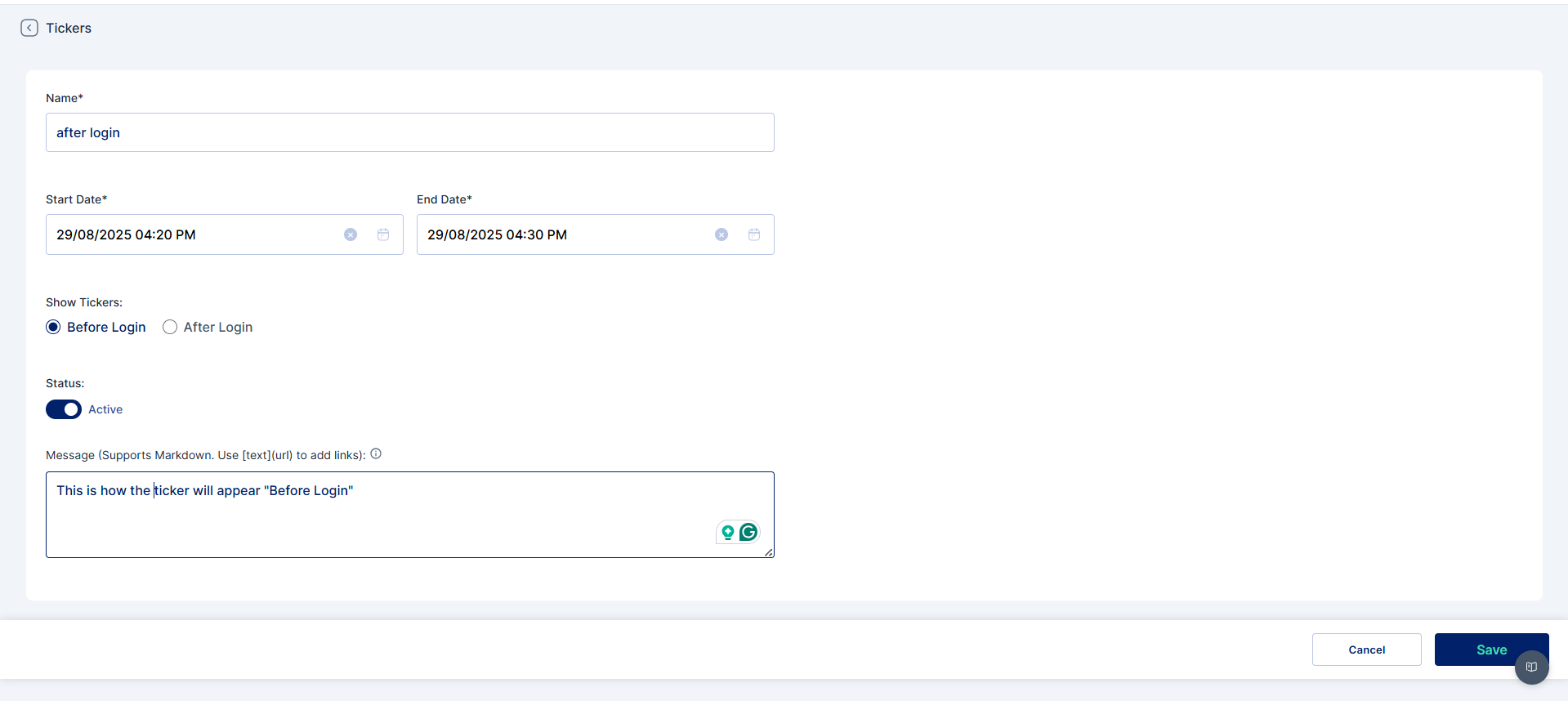 * **Show Tickers**: Set to Before Login to ensure the message is displayed on the login page.
