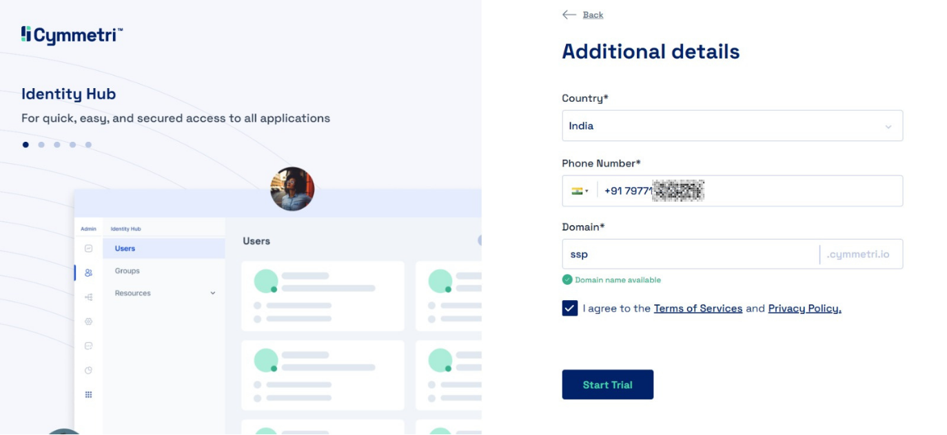 2. Enter your country and phone number (mandatory to receive OTP), and enter a domain name for your tenant. In case the domain available message is not shown, choose a different domain name. Click on the **Start Trial** button.&#x20;