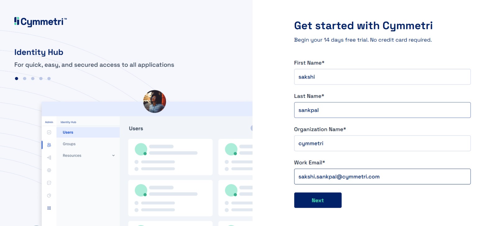 1. Start by clicking on the link [register.cymmetri.io](https://register.cymmetri.io/) to start the registration of your tenant on the Cymmetri Cloud 2.0, and enter your personal details with your work email. Click on Next. &#x20;