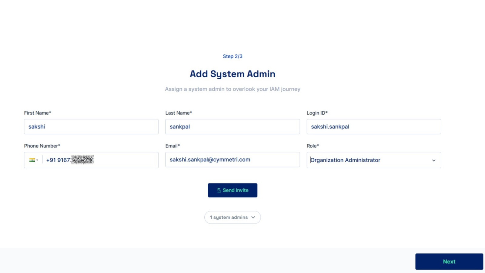 9. Enter details to create a second administrator account. Click on the Send Invite button to create an administrator. Click on the Next button to proceed. &#x20;