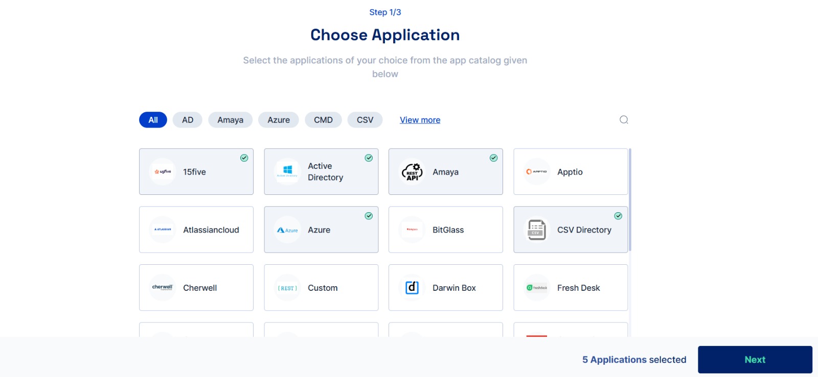 8. Choose applications from the application catalogue, and click on the application icon for all the applications you wish to add. Then click on the Next button.&#x20;