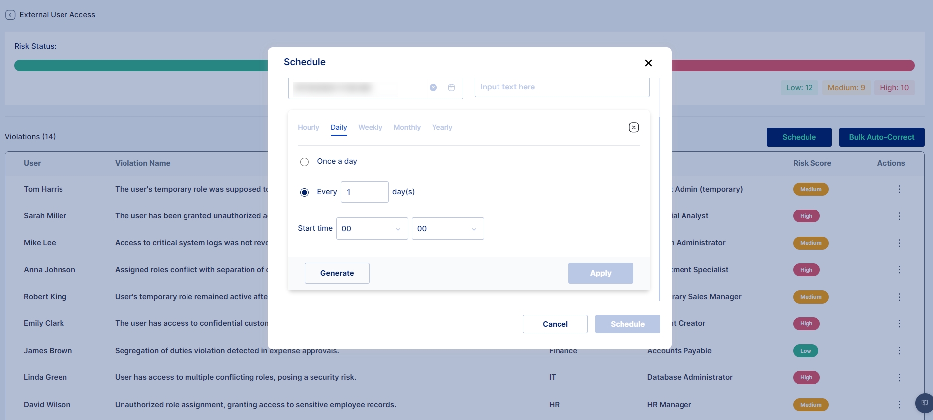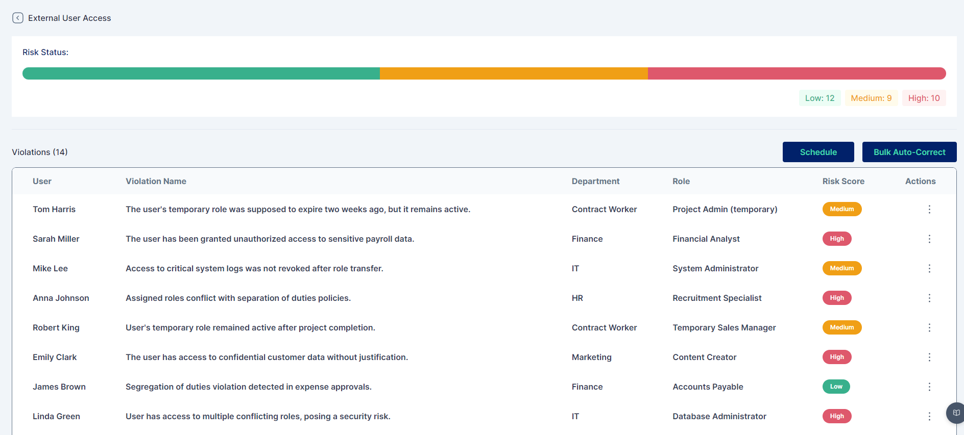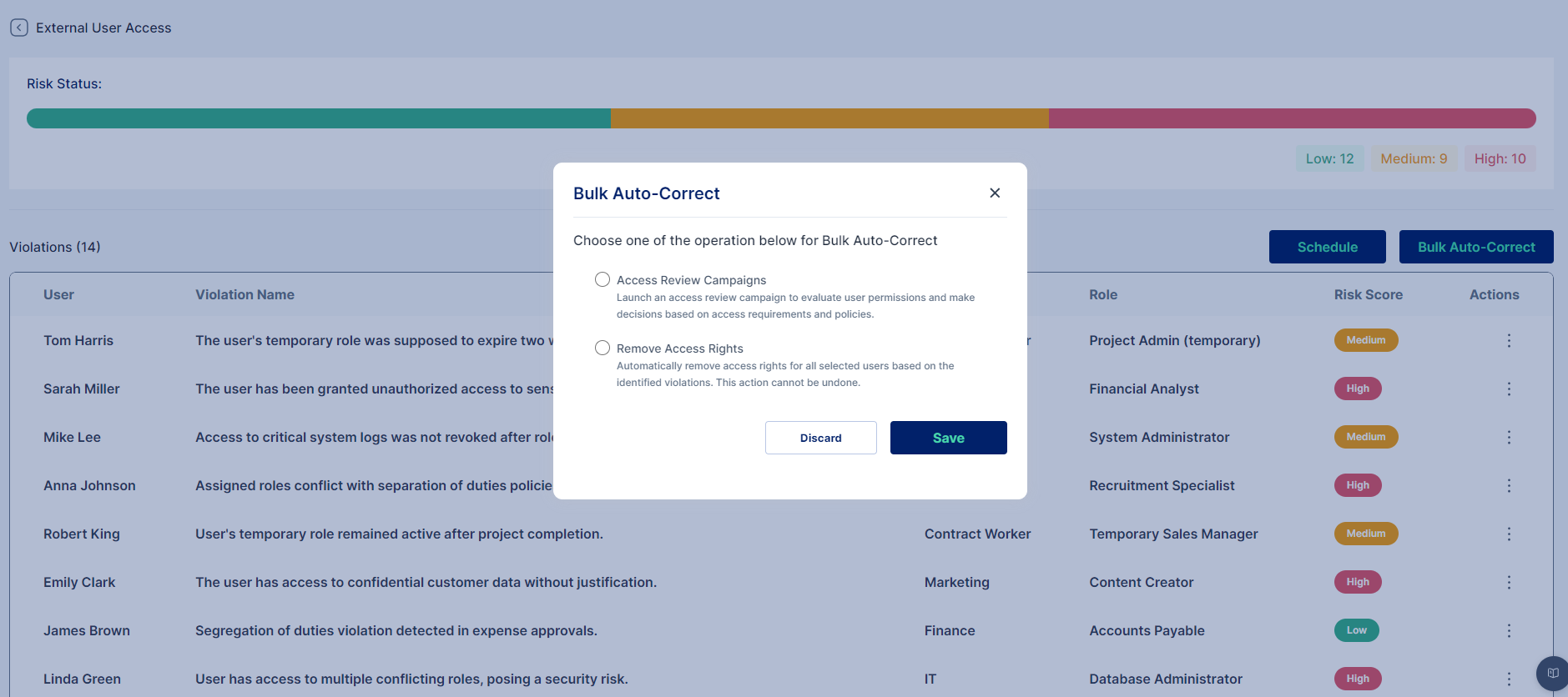 To ensure prompt remediation of critical violations, the IGA system offers an Auto-Correct feature. This feature automates the process of resolving violations by initiating corrective actions, such as access reviews or approval workflows.