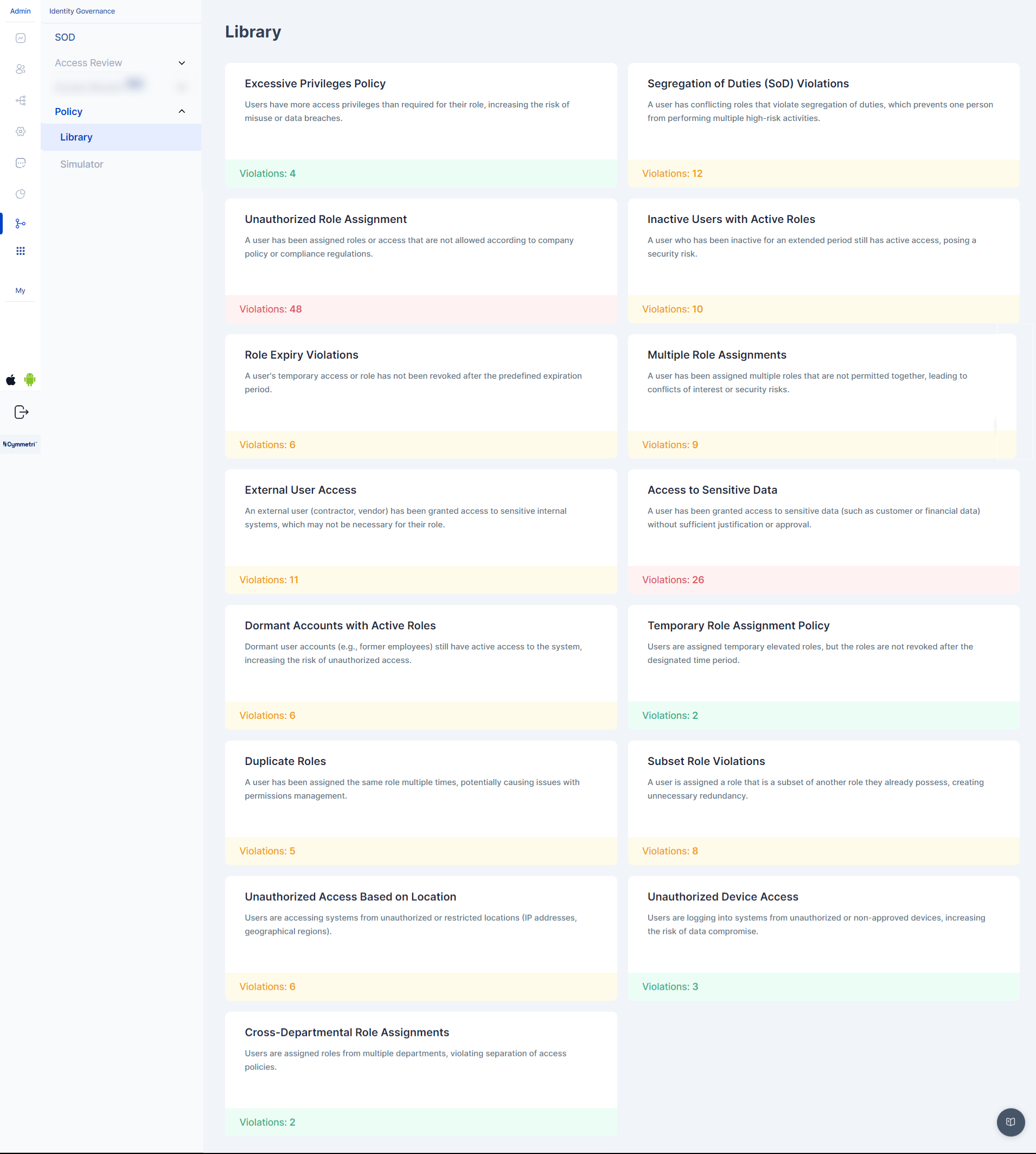 The IGA system maintains a centralized Library of Default Violations, which includes predefined policy violations. These violations are categorized based on typical governance issues, such as excessive access, unauthorized role assignments, or segregation of duties (SoD) violations.