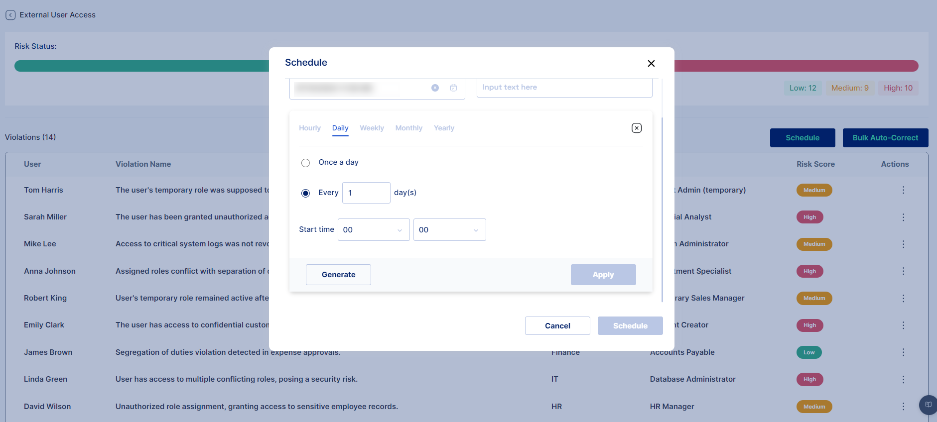 Choose the Violation Types and Risk Levels to include (e.g., Excessive Privileges, High-risk violations).