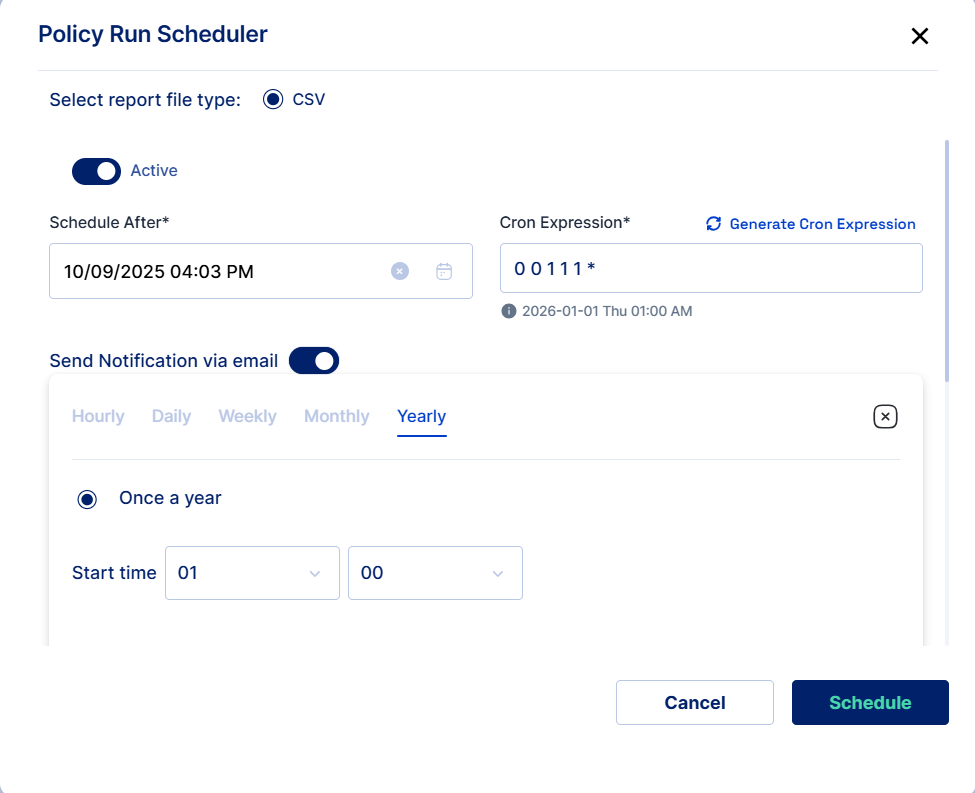 Cron Expression: A time-based expression that defines the exact execution time. Administrators can configure the policy to run on an hourly, daily, weekly, monthly, or even yearly basis. This allows for a high degree of flexibility in aligning policy checks with organizational security cadences.