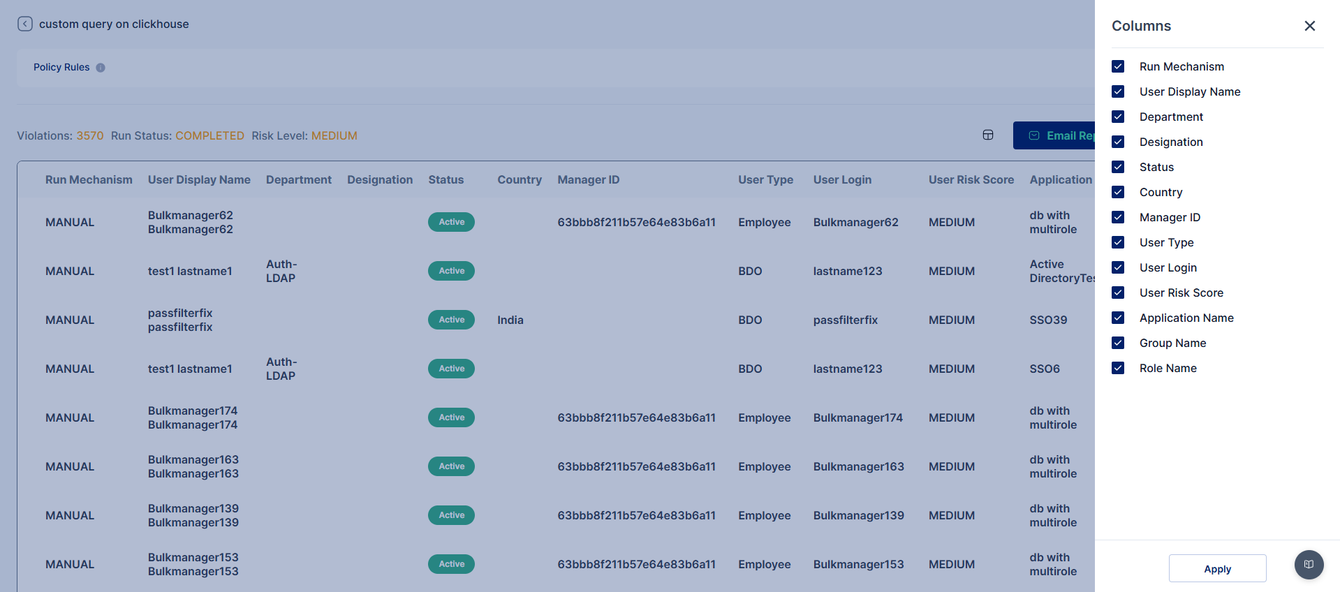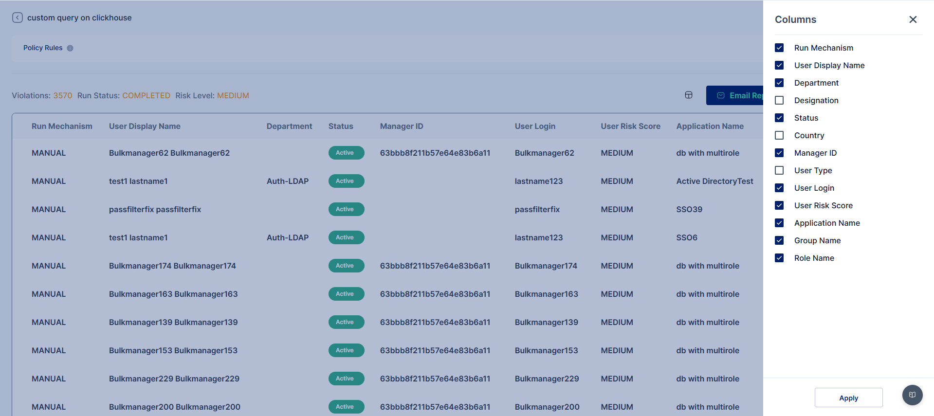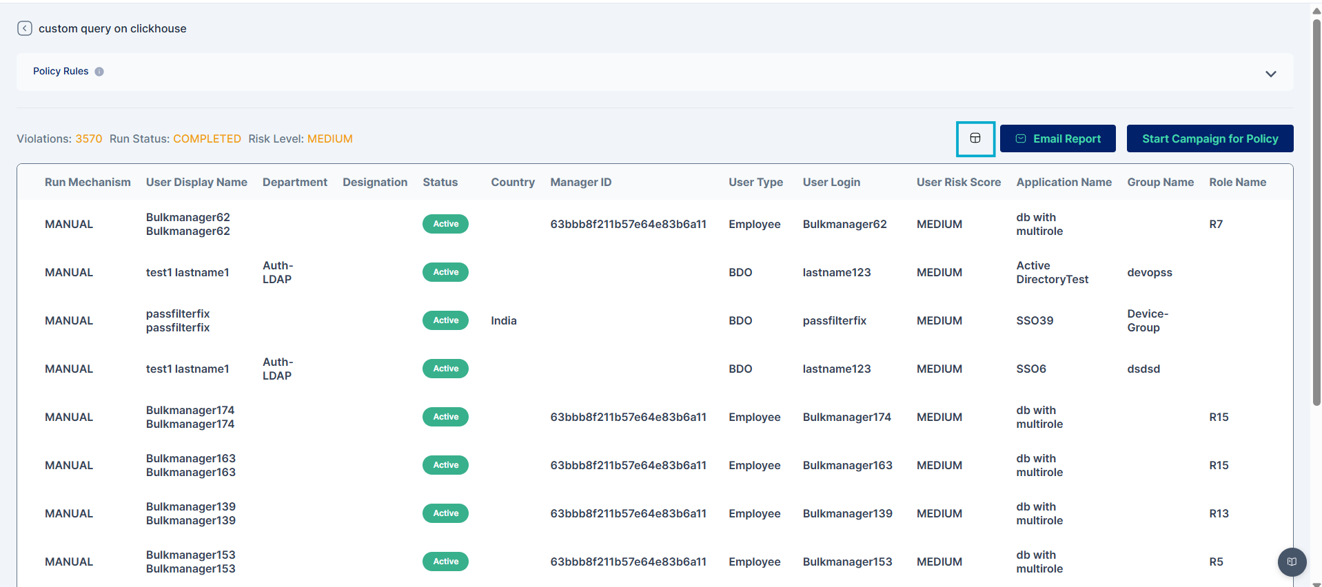 After applying the desired filters and selecting the columns to display, the administrator can view a clean, organized dataset. This provides all the necessary information to make informed decisions and take the appropriate action on the policy violations.