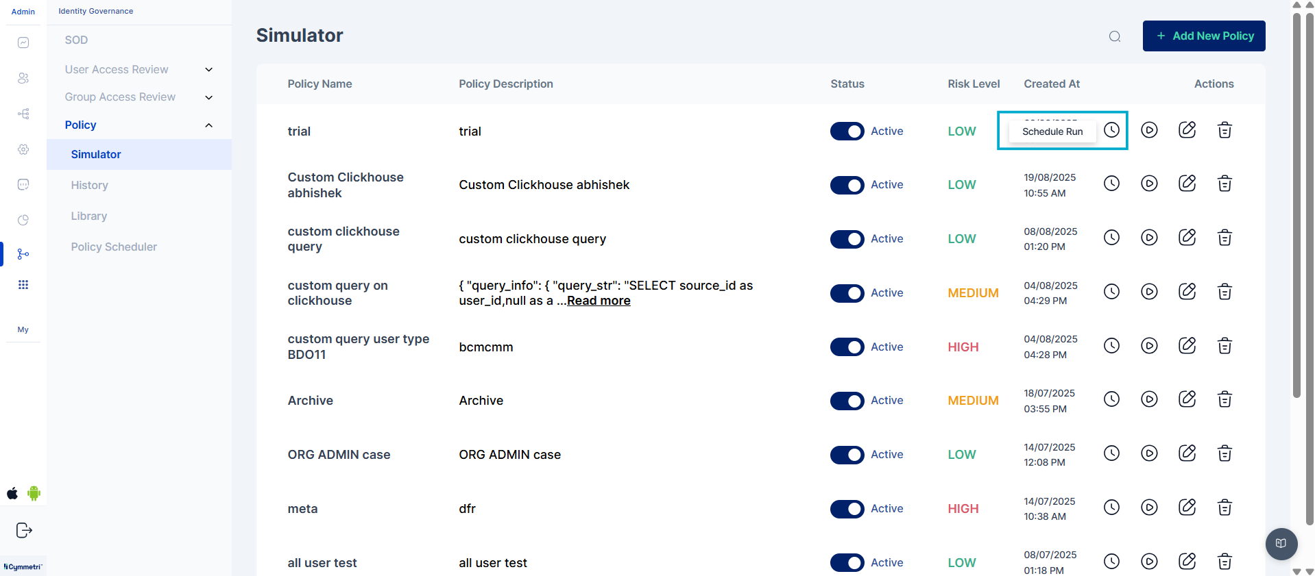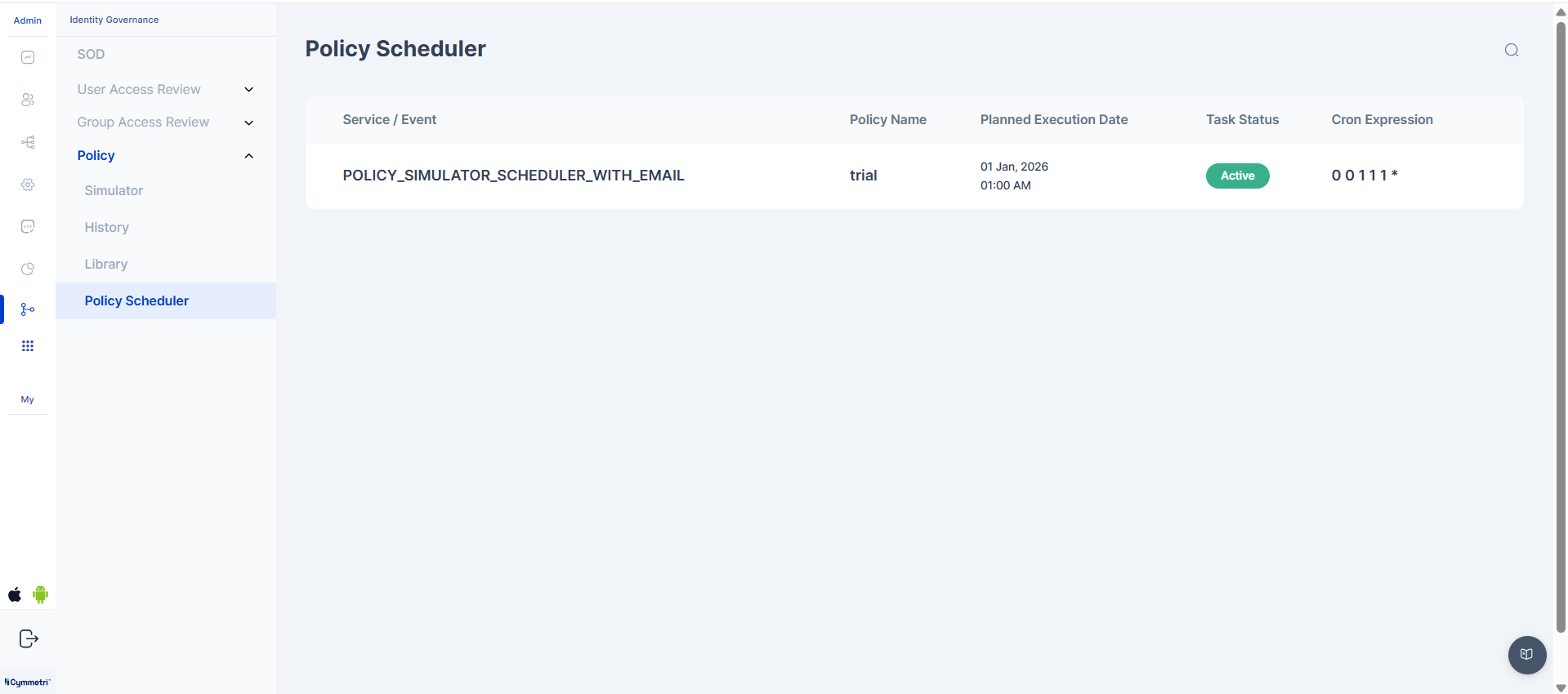 All scheduled policies are listed under the Policy Scheduler section of the Cymmetri interface. This provides administrators with a centralized view of all active scheduled jobs, allowing for easy management and modification.